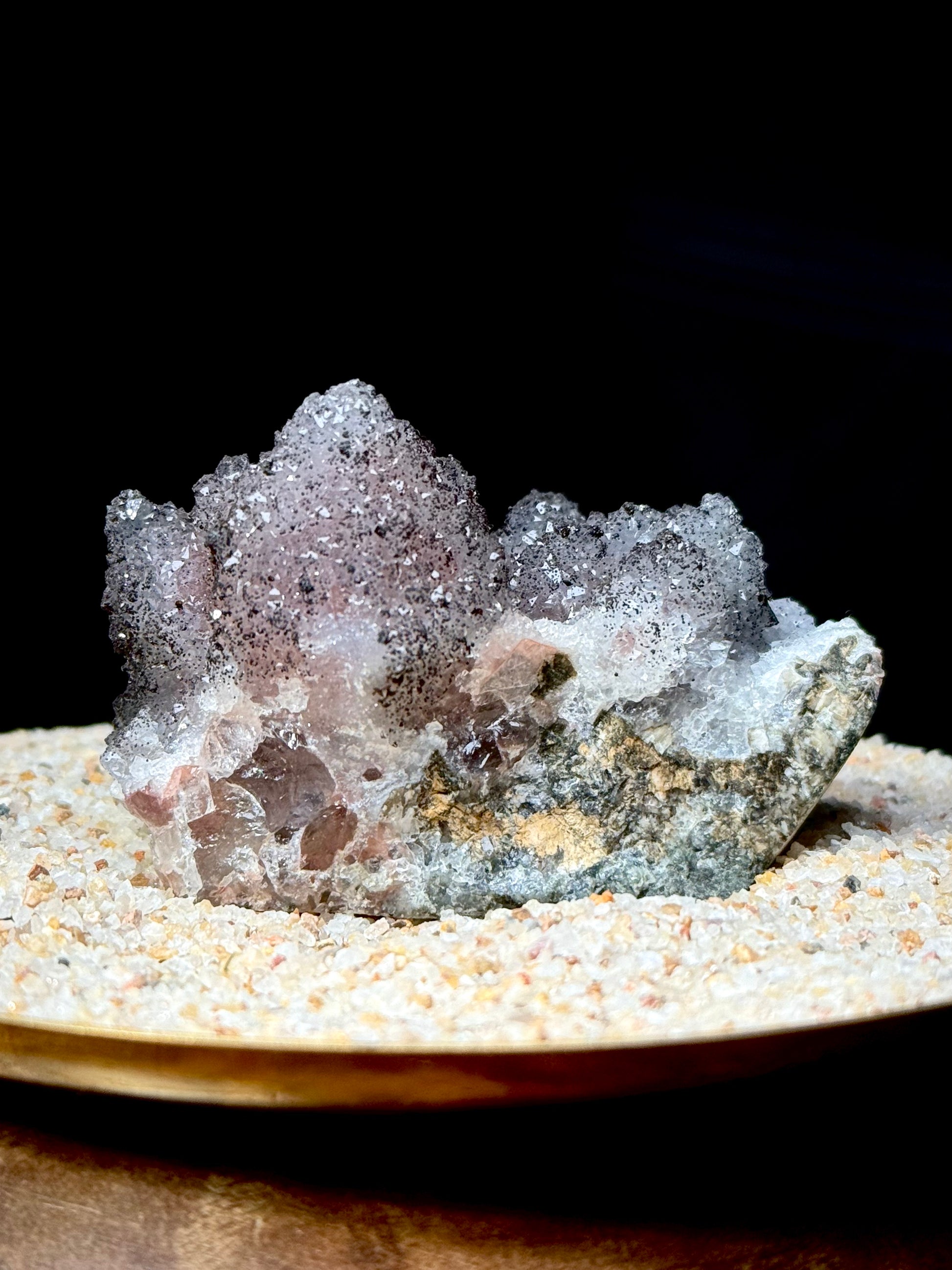 An amethyst piece that has a red hematite core within the quartz and a secondary layer of growth of amethyst with hematite specks on the surface.