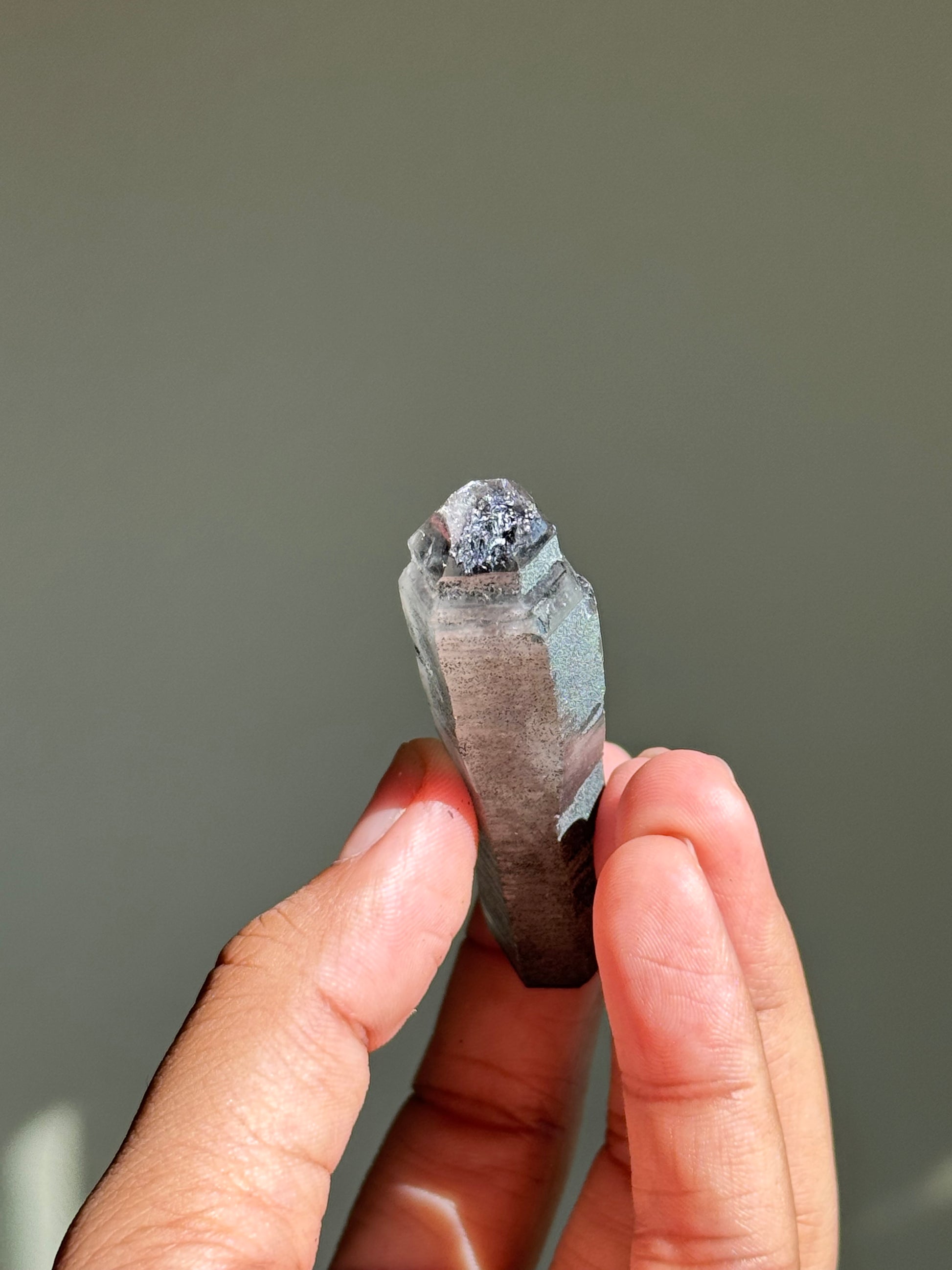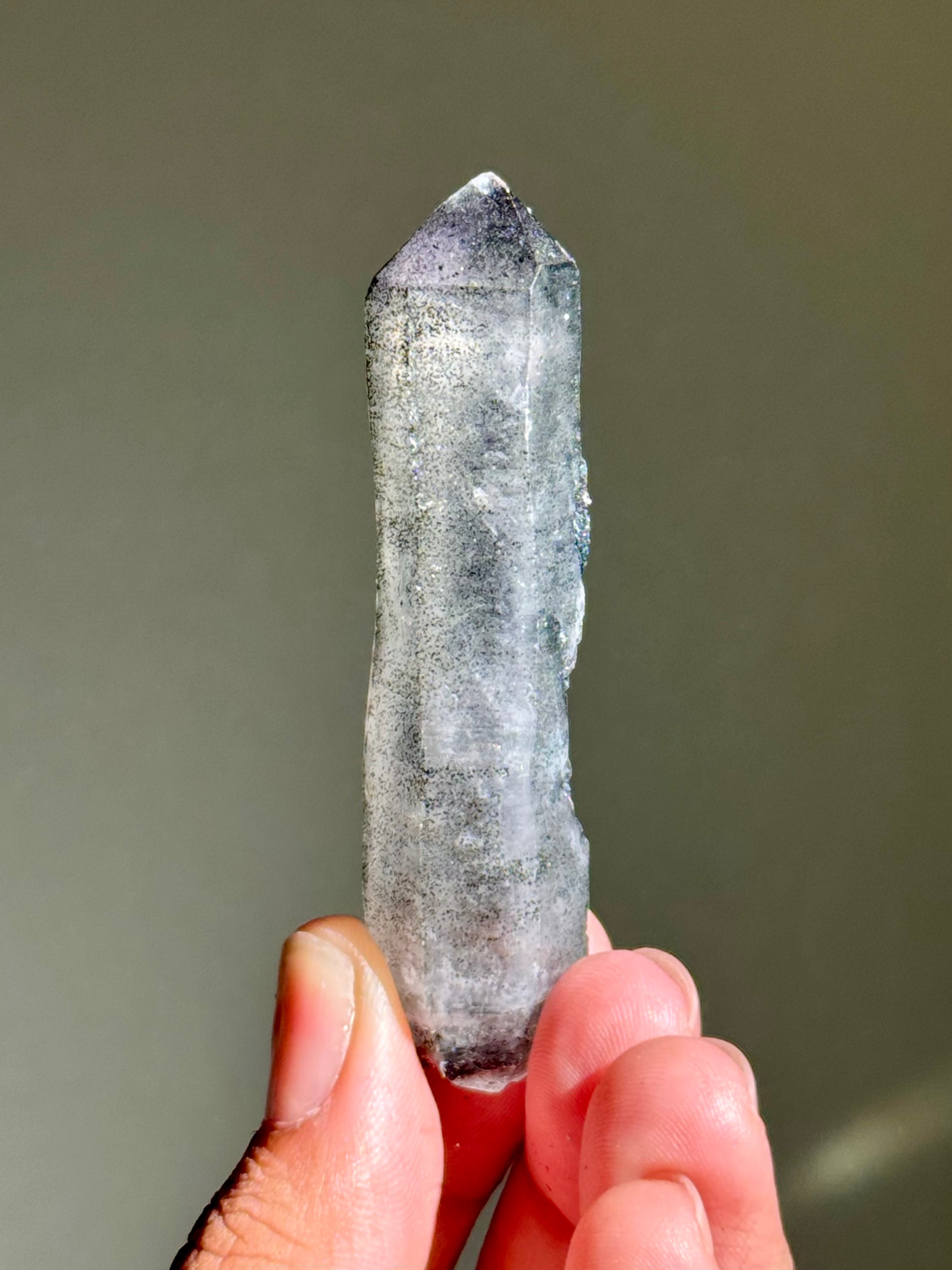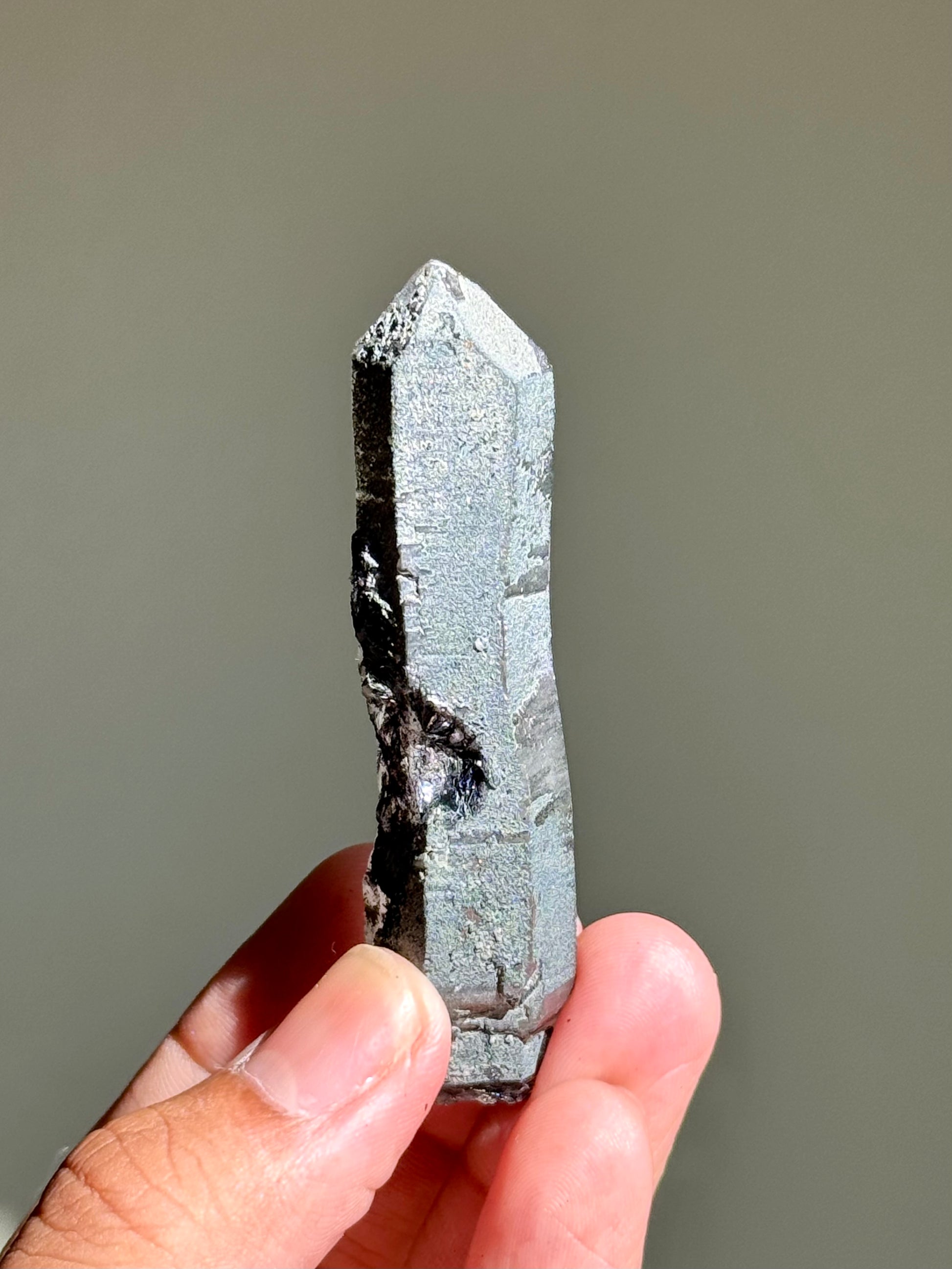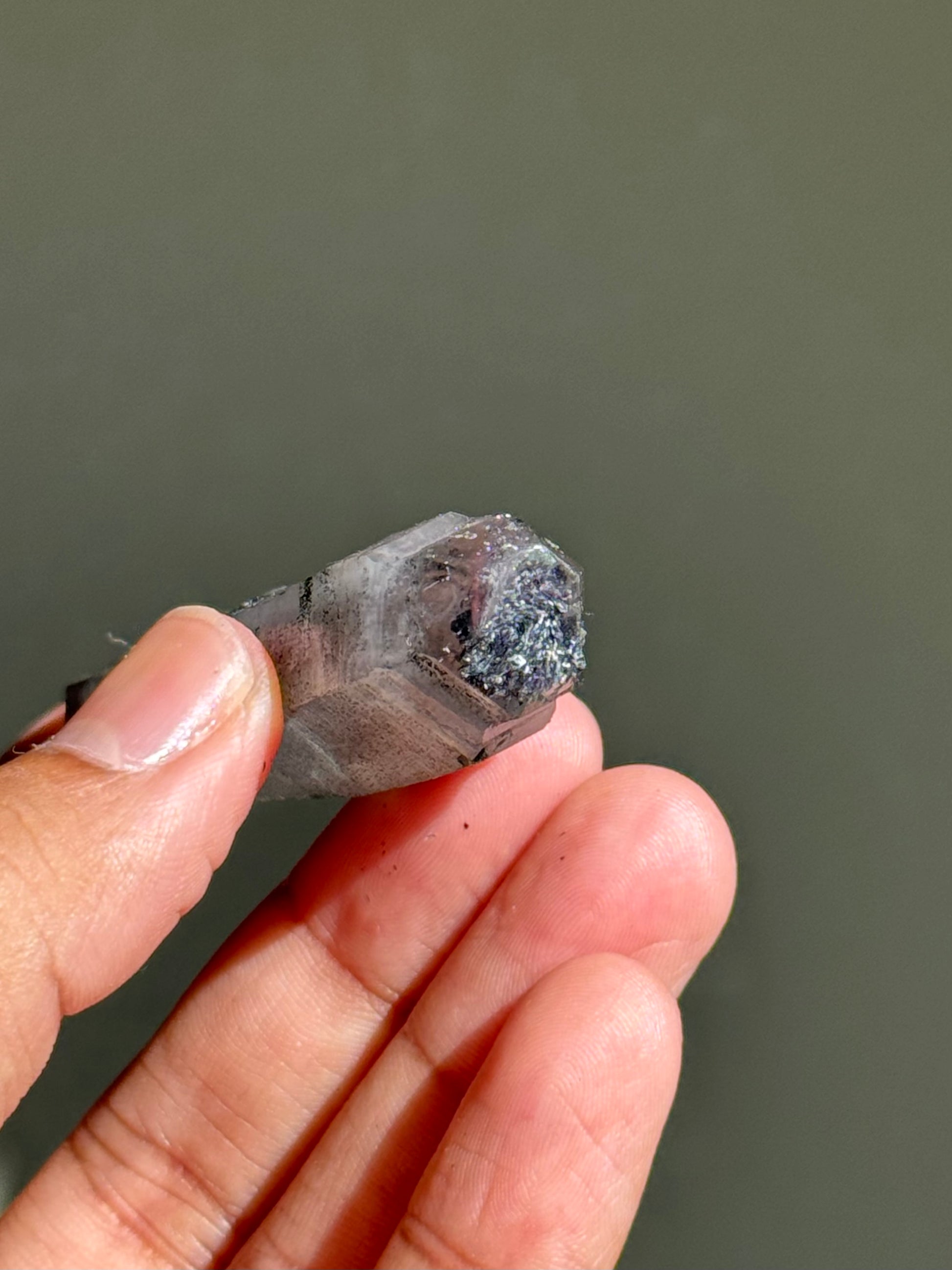 An amethyst with hematite. The faces on this piece have been semi-polished to allow its inner color to be seen better. I like to call this specific find 月亮紫晶 or moon song amethyst for their dark & mysterious beauty.