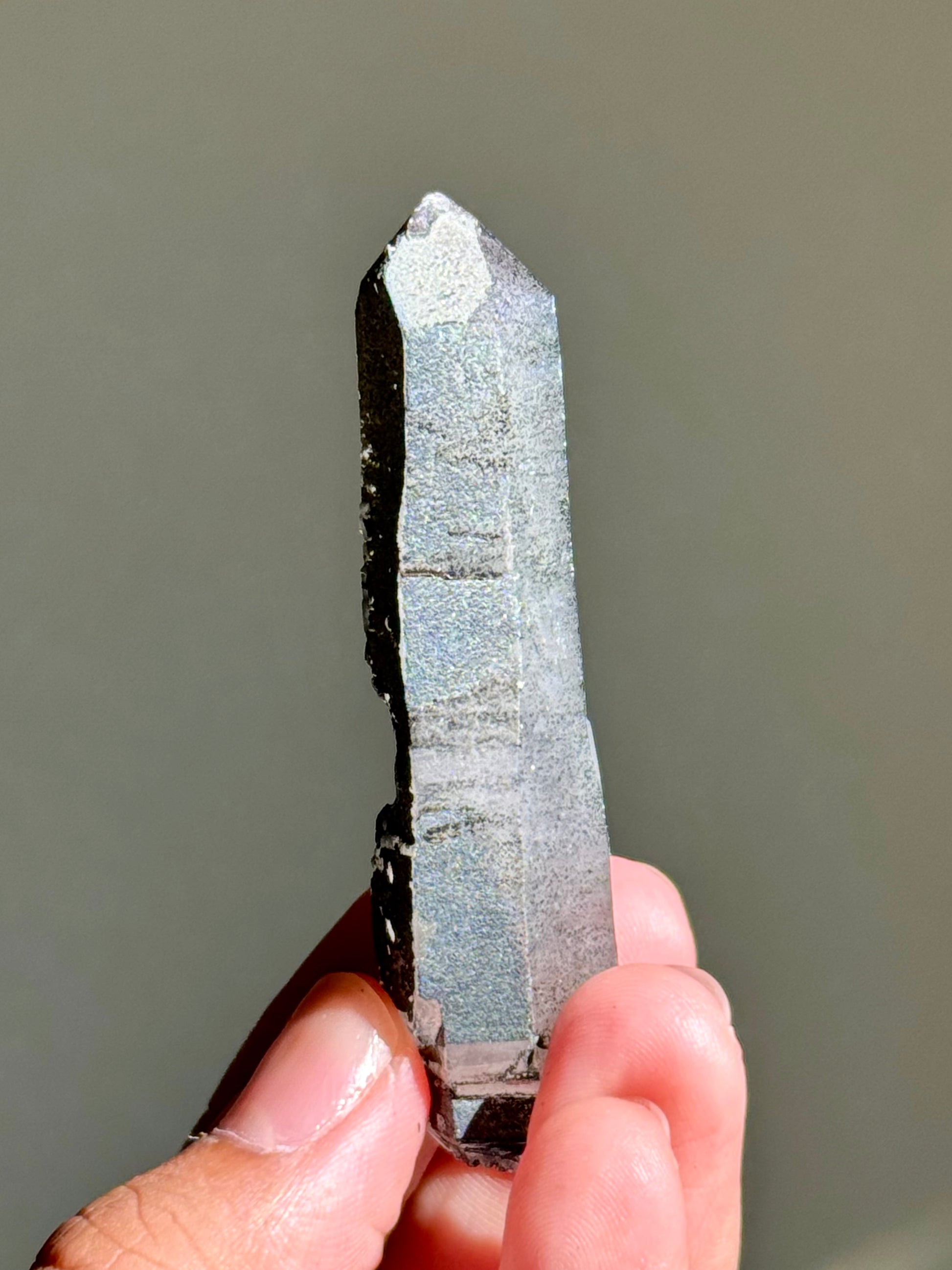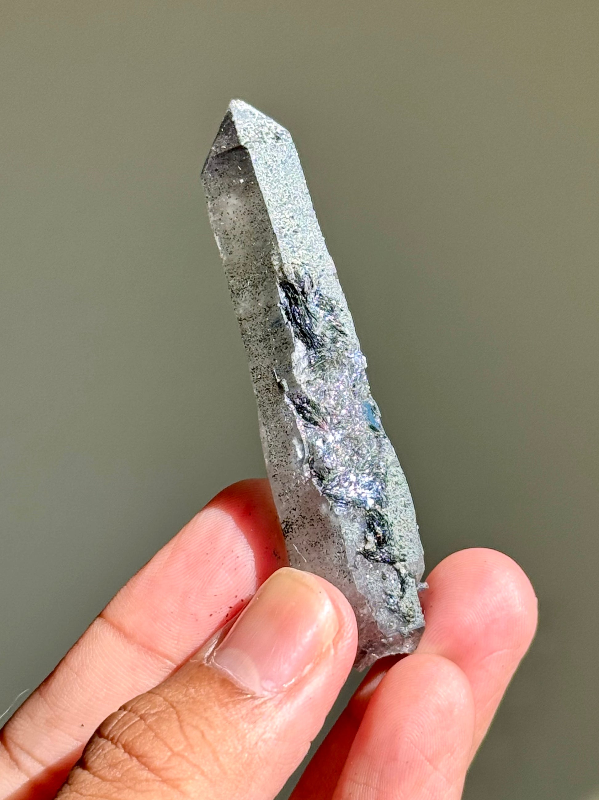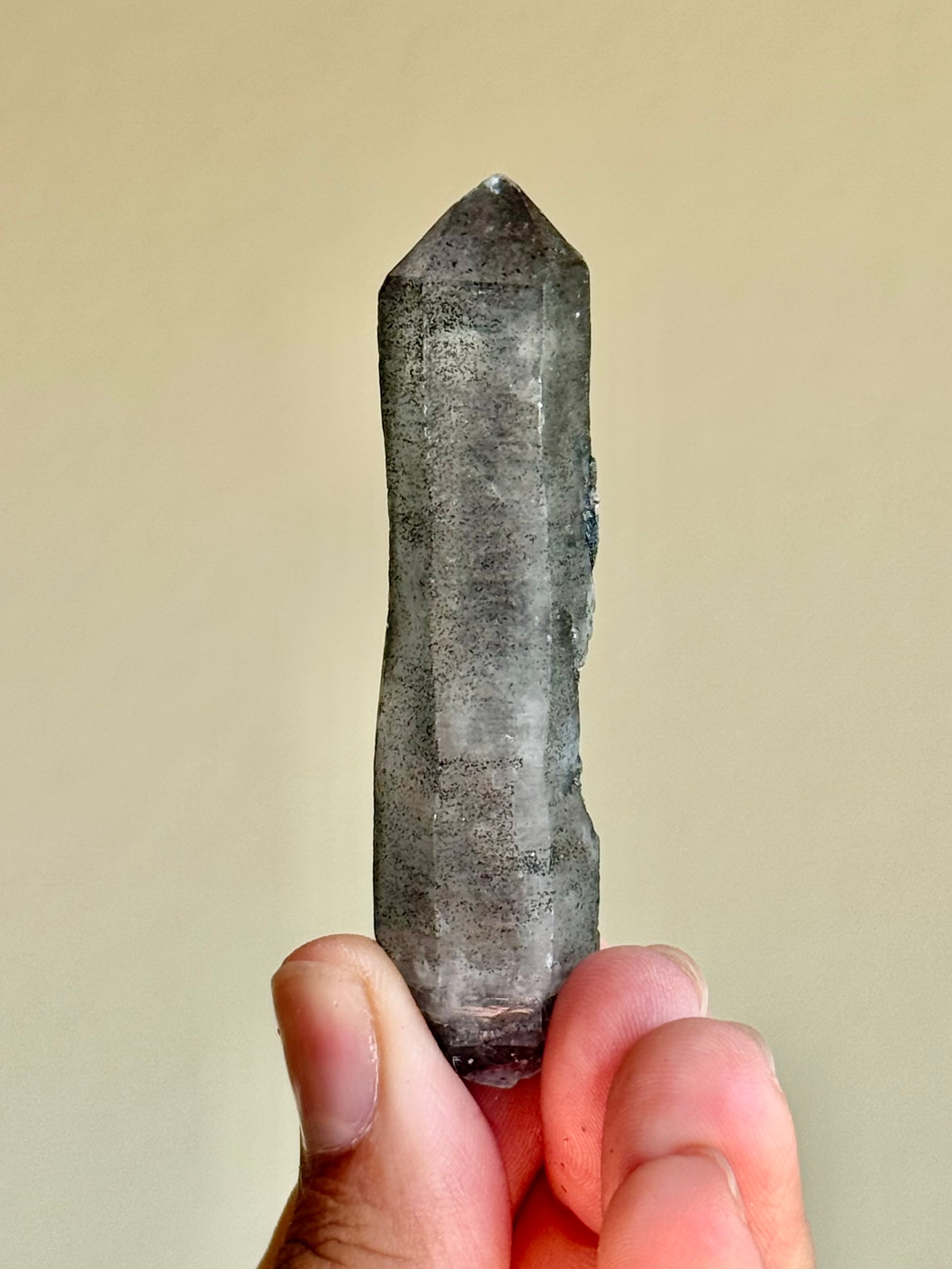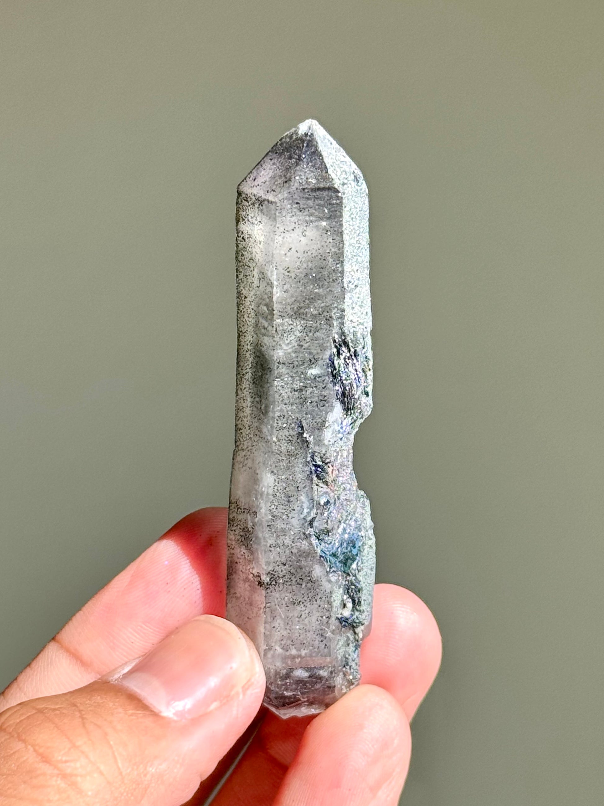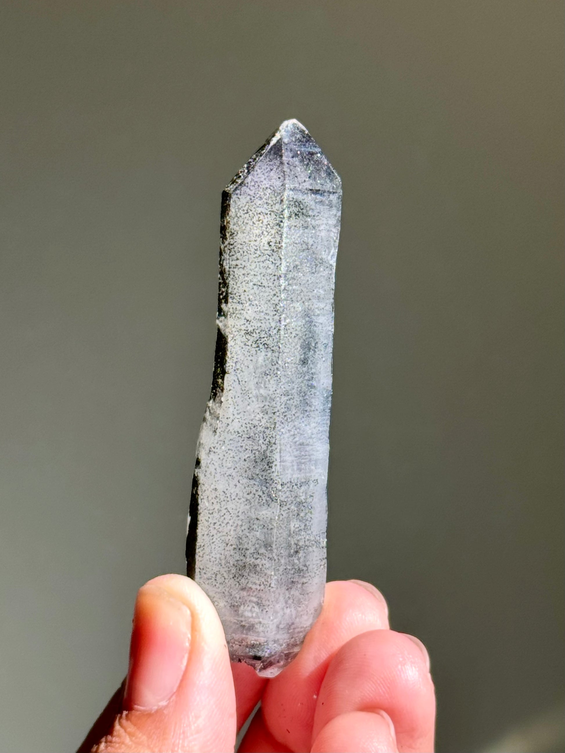 An amethyst with hematite. The faces on this piece have been semi-polished to allow its inner color to be seen better. I like to call this specific find 月亮紫晶 or moon song amethyst for their dark & mysterious beauty.