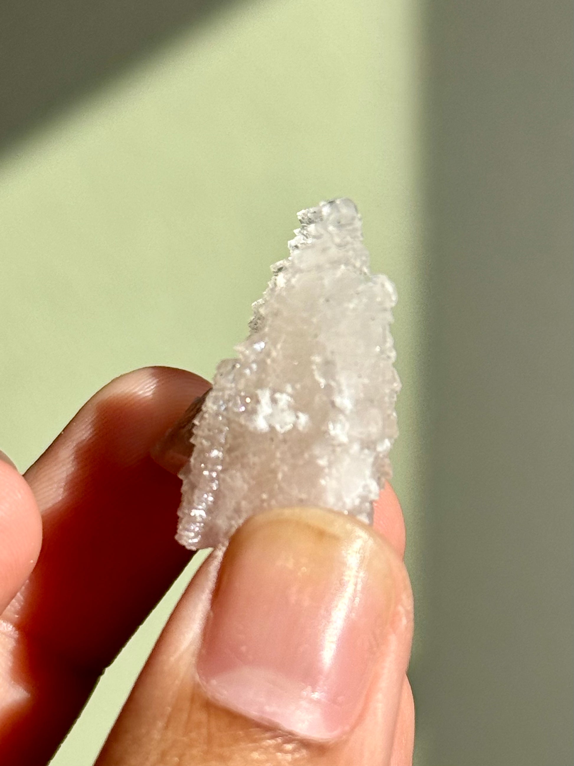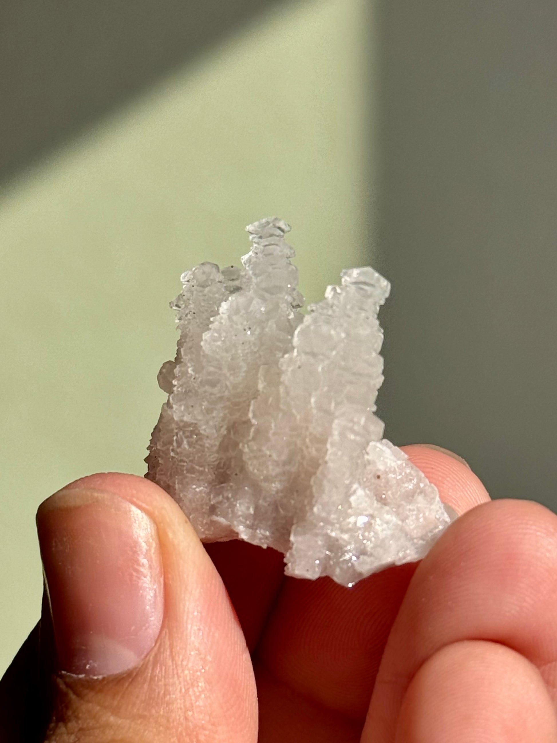 A clear, stacked pagoda calcite cluster. The inner-most calcite is a soft yellow, which lends the calcite a soft golden hue in certain lighting.