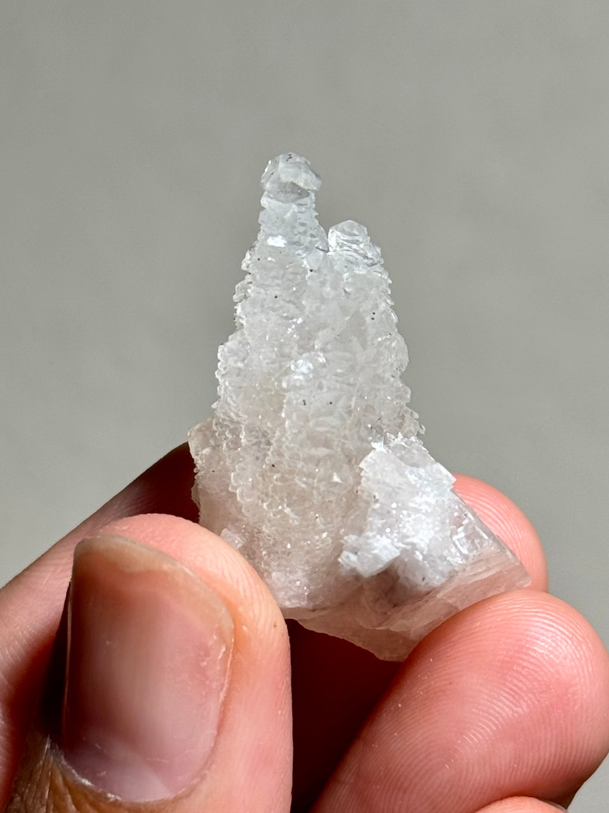 A clear, stacked pagoda calcite cluster. The inner-most calcite is a soft yellow, which lends the calcite a soft golden hue in certain lighting.