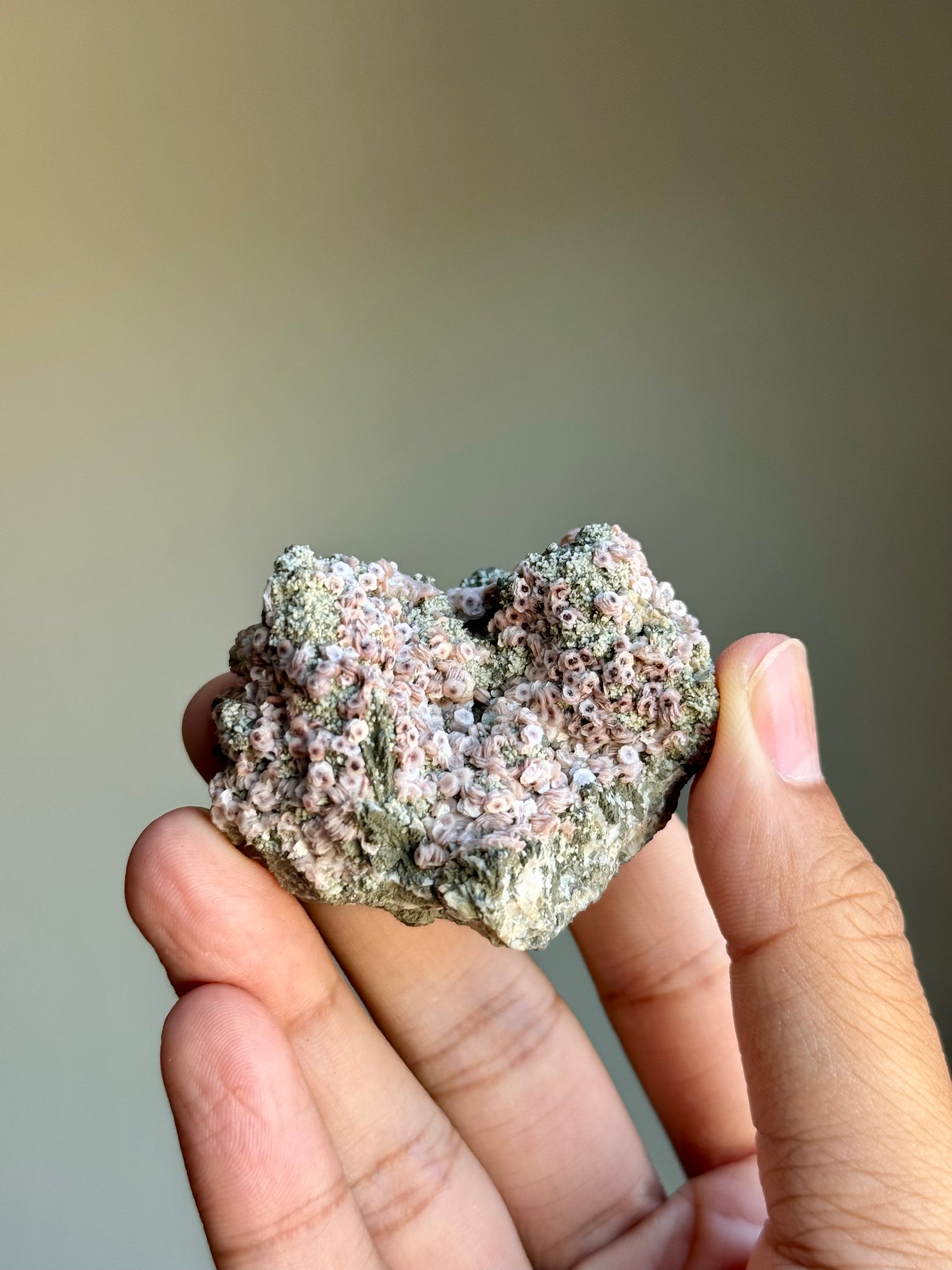 These pink disc calcite specimens with green accents remind me a lot of a landscape that you would see in a fantasy! It’s very reminiscent of a field of flowers.