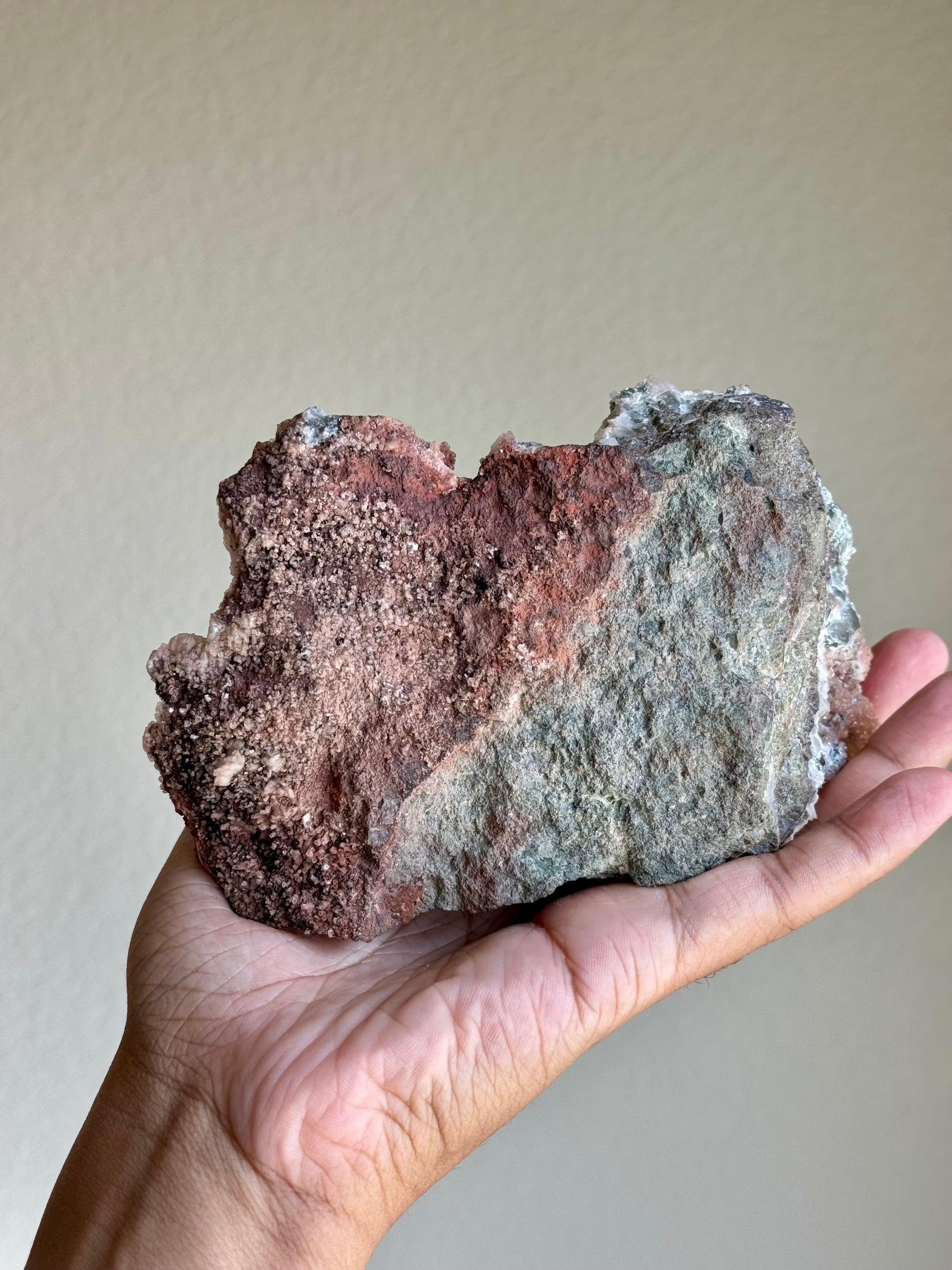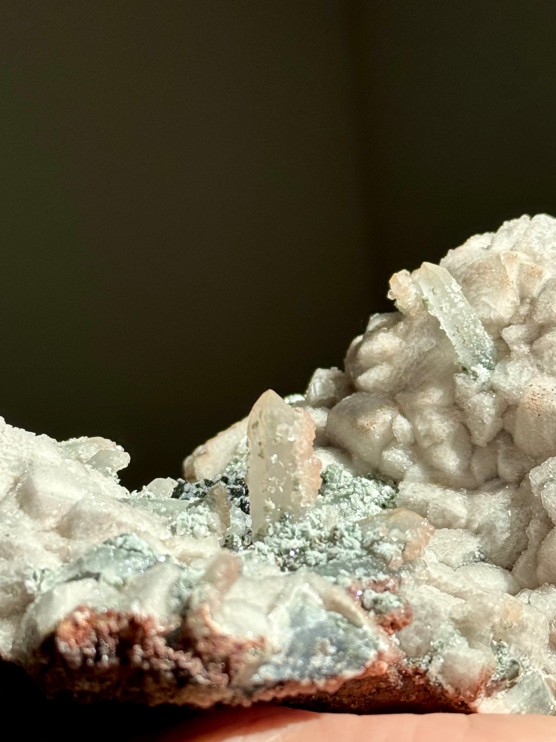 A rather unique calcite specimen with a few quartz points and a hematite rosette in the center.