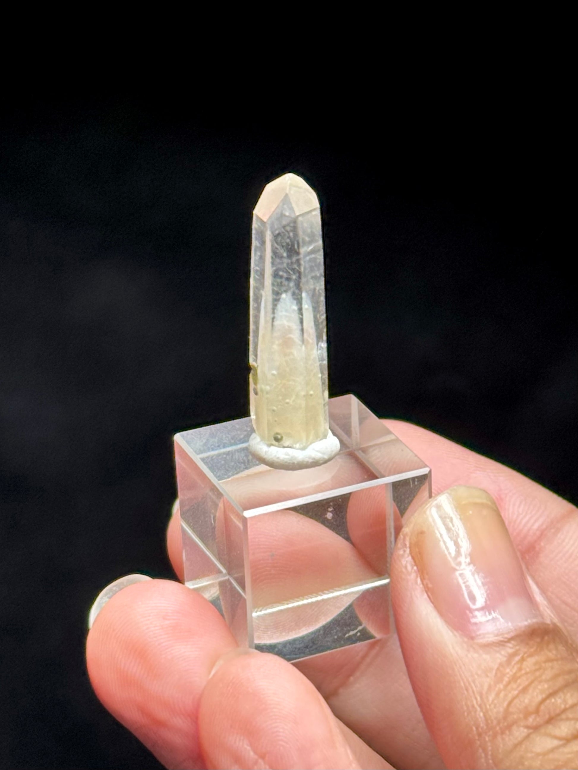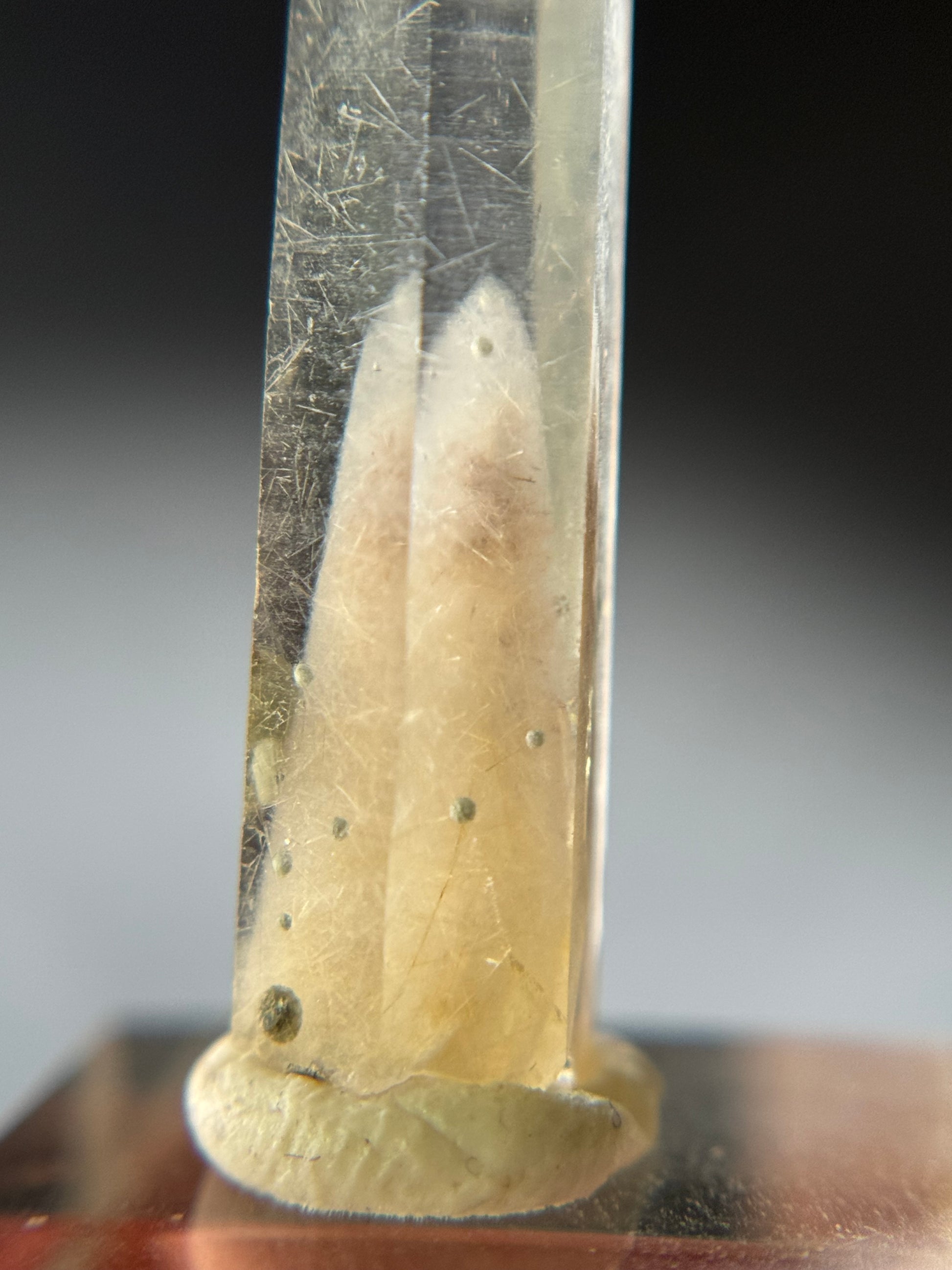 A small quartz point with cookite & tremolite inclusions. This specific quartz variation from Japan is also known as Marimo Quartz, due to the Cookite inclusions looking similar to marimo moss balls.