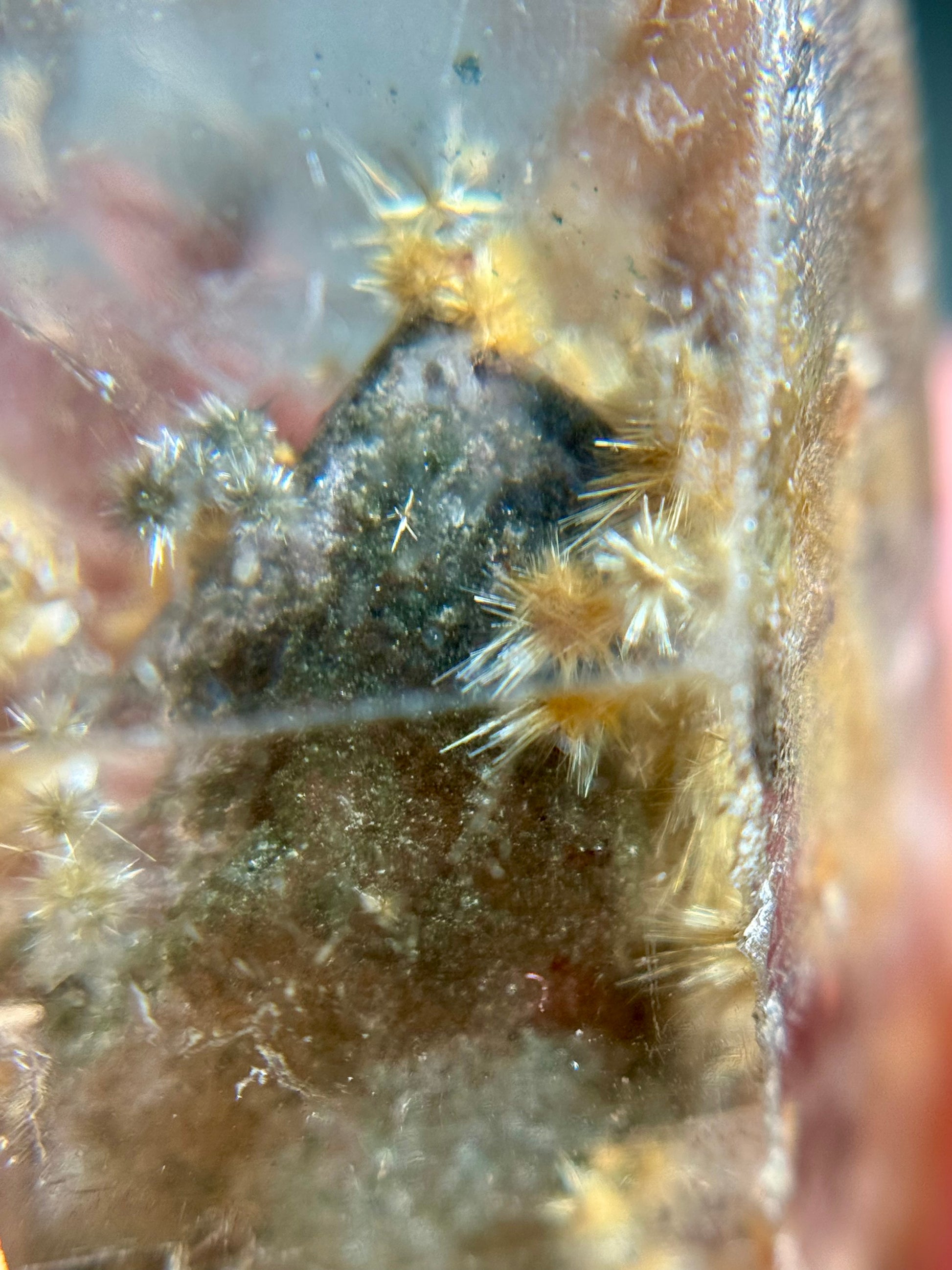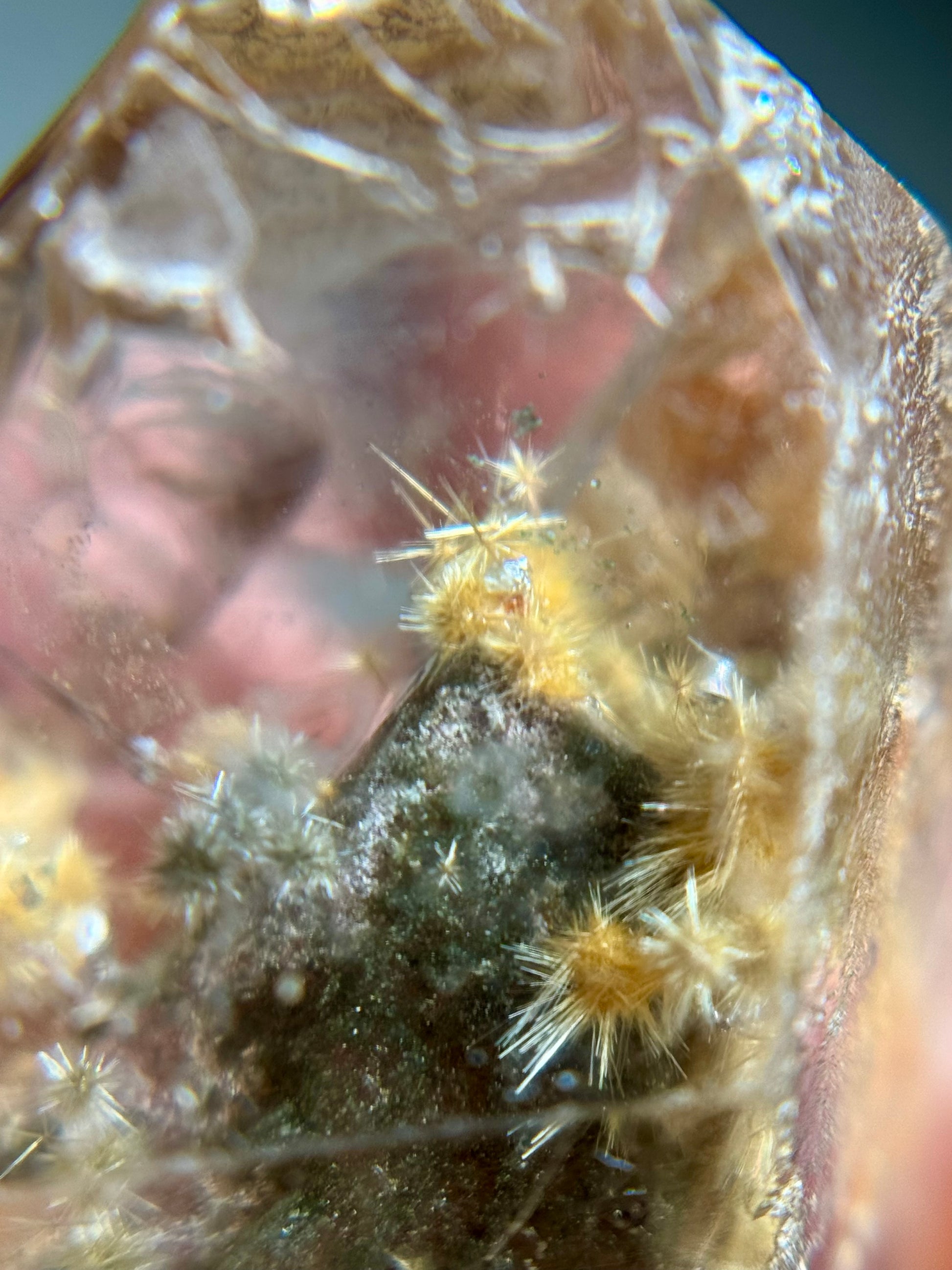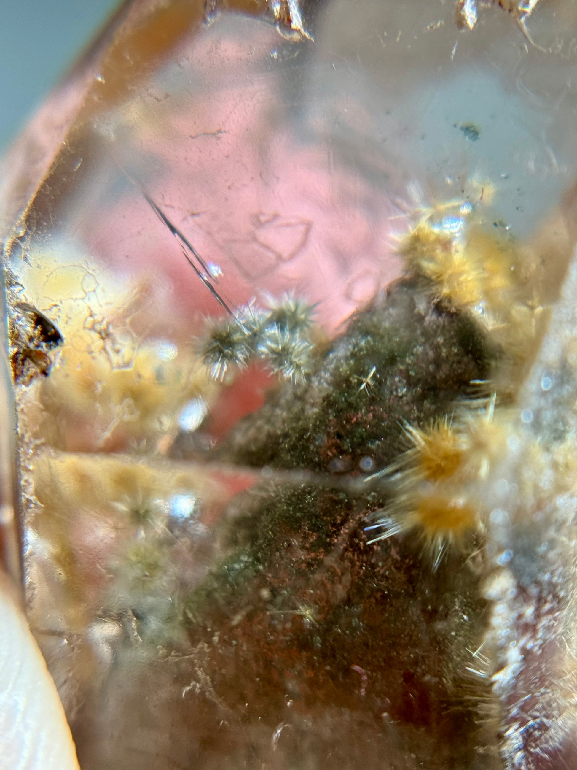 A piece of quartz with dandelion rutile inclusions perched onto its inner garden phantom.