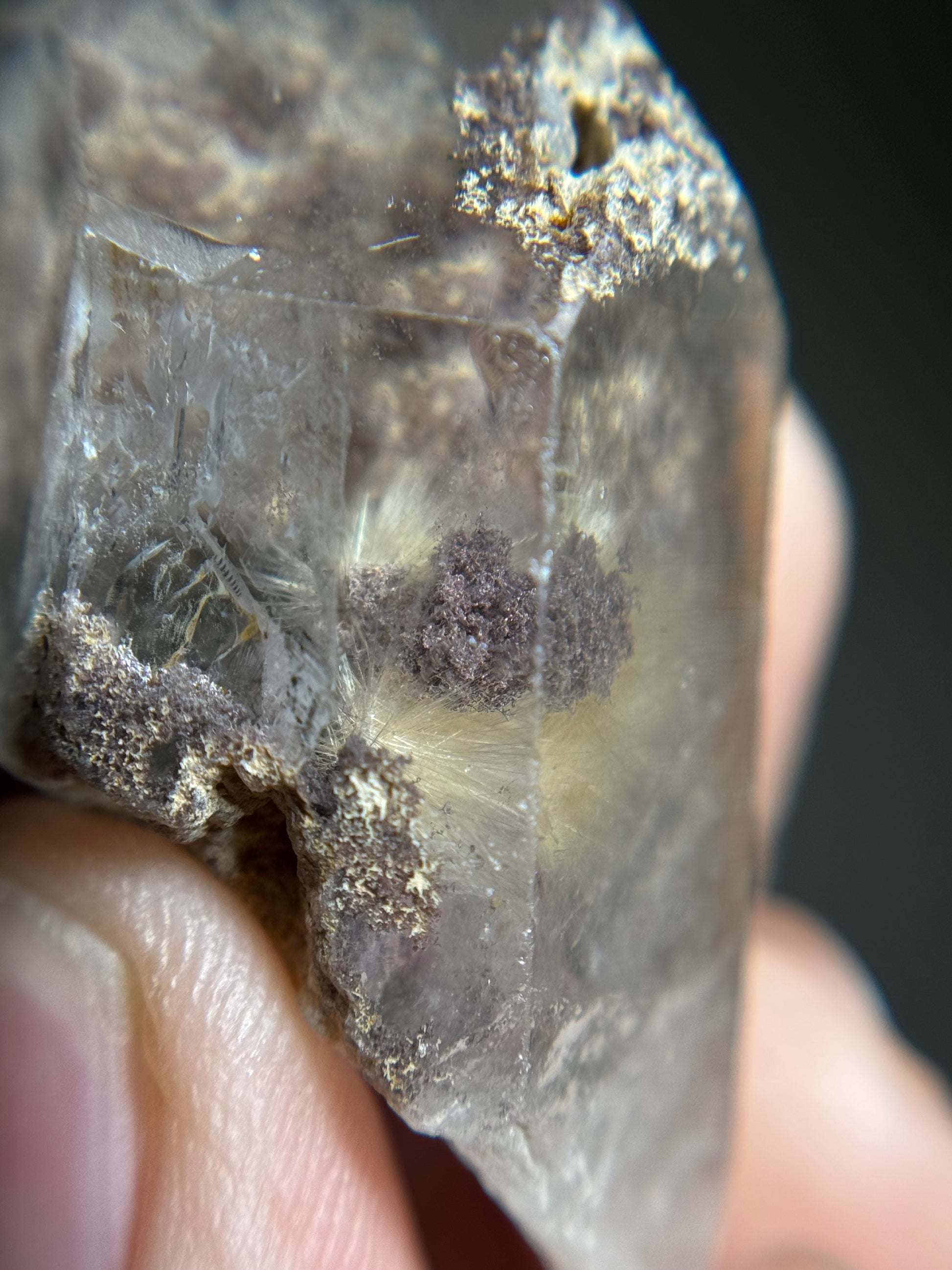 A small quartz point with dandelion rutile and garden inclusions.
