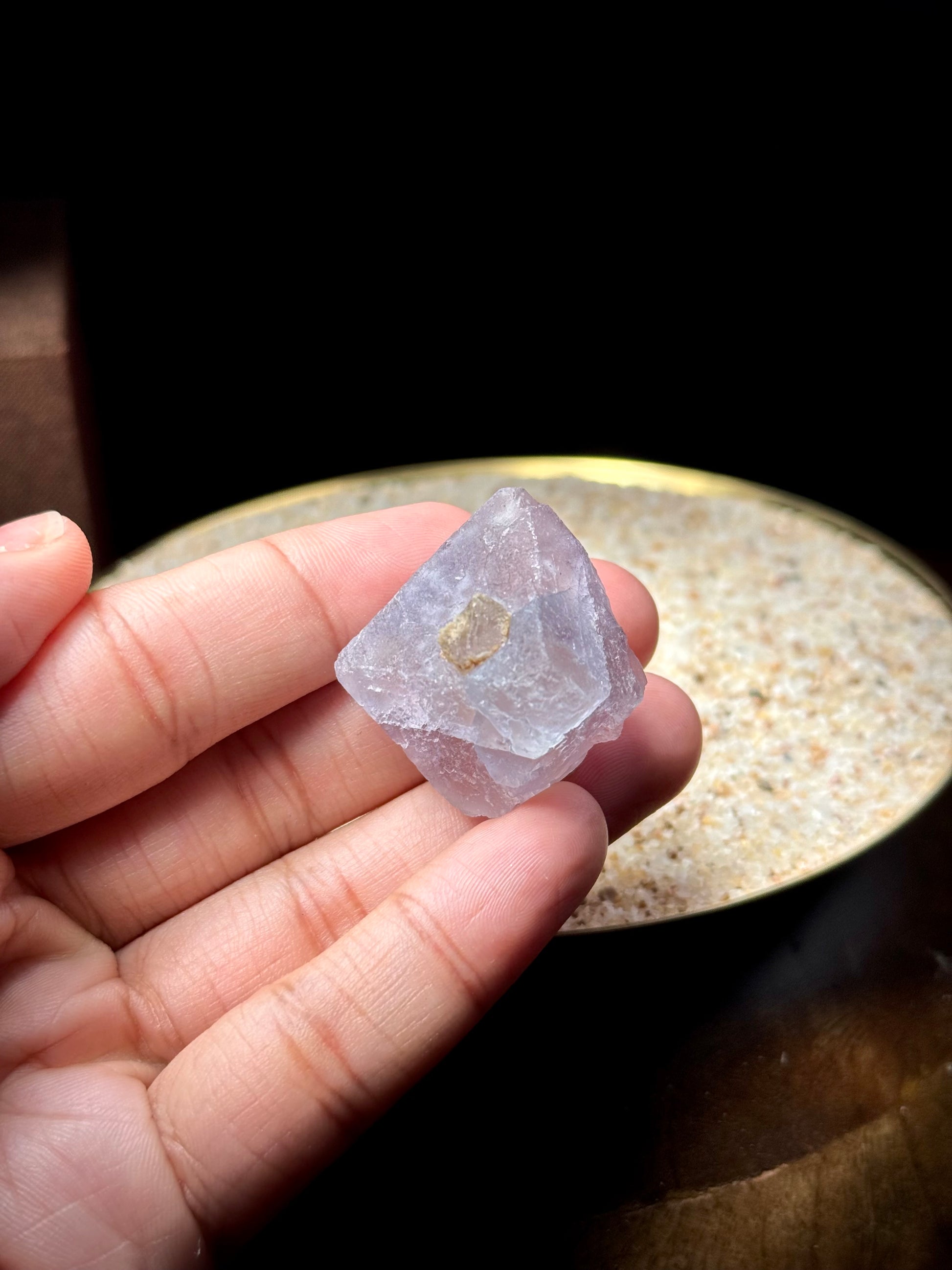 A bi-color (blue & pink) octahedral fluorite from Inner Mongolia, China. This fluorite has a quartz bar penetrating it, with each end of the quartz exposed on either end of the fluorite. When backlit, the color scheme is a little reminiscent of cotton candy.