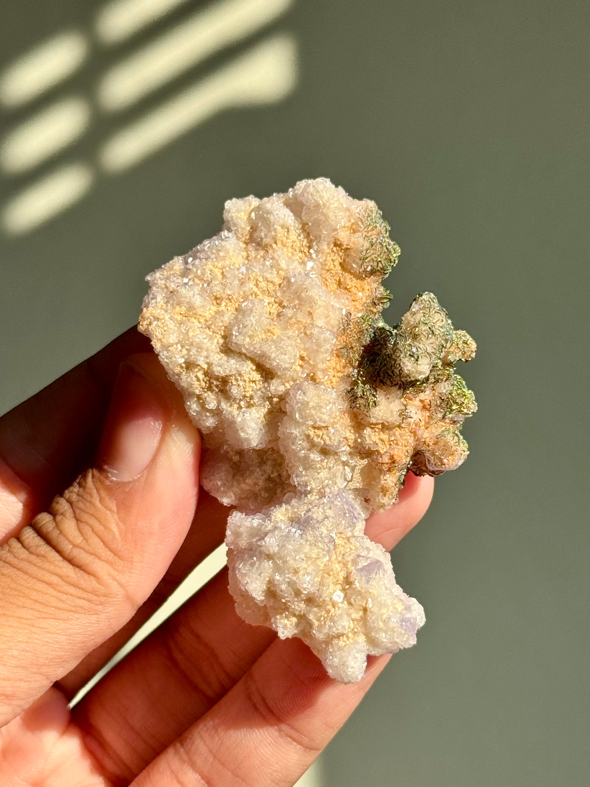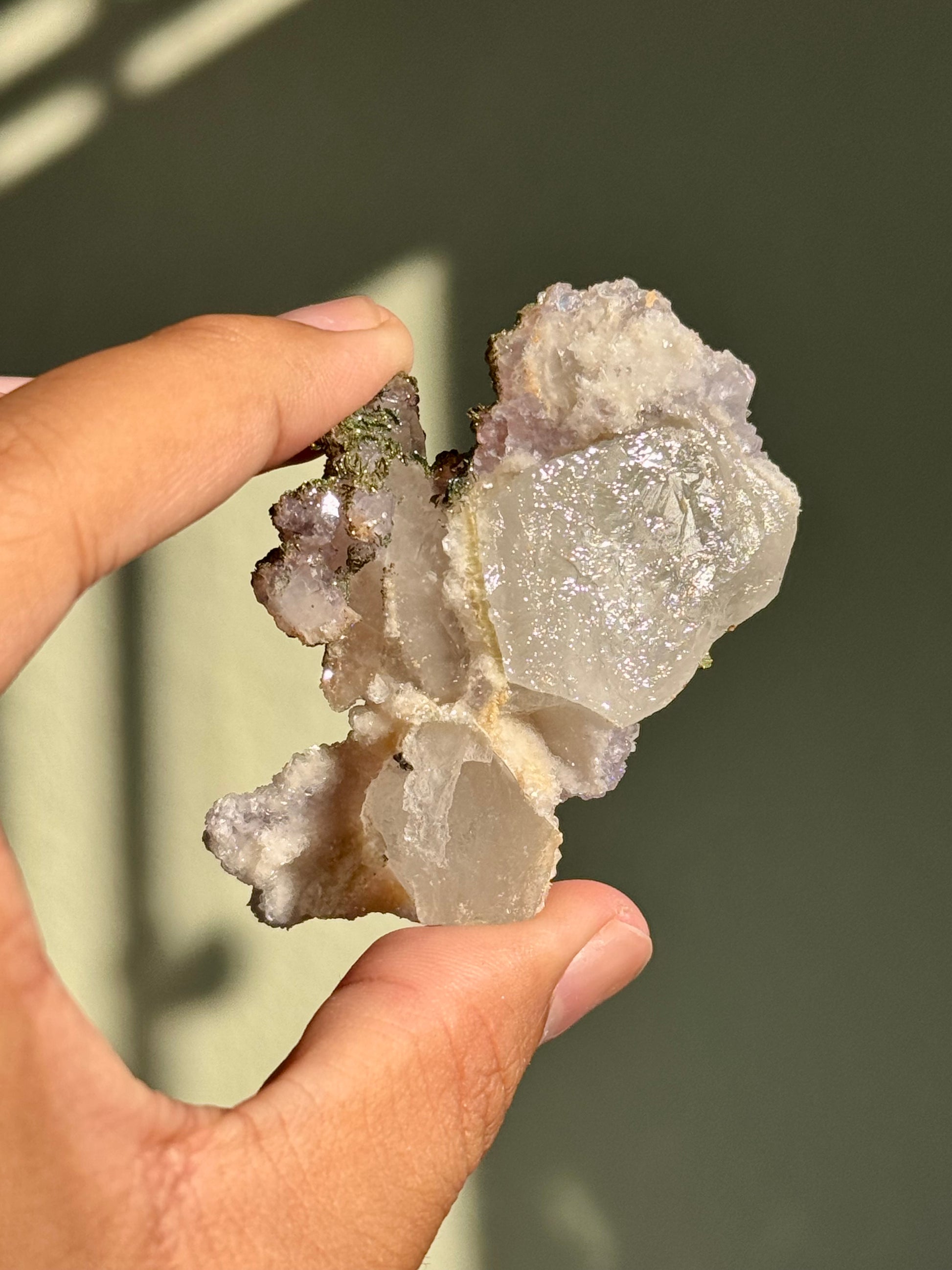 A piece of quartz with fluorite, dolomite and calcite covering it. The calcite is coated with iridescent chalchopyrite.