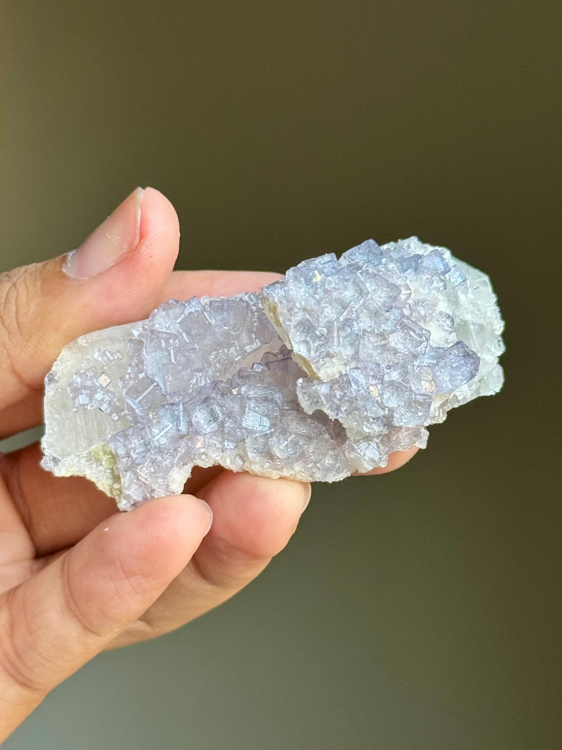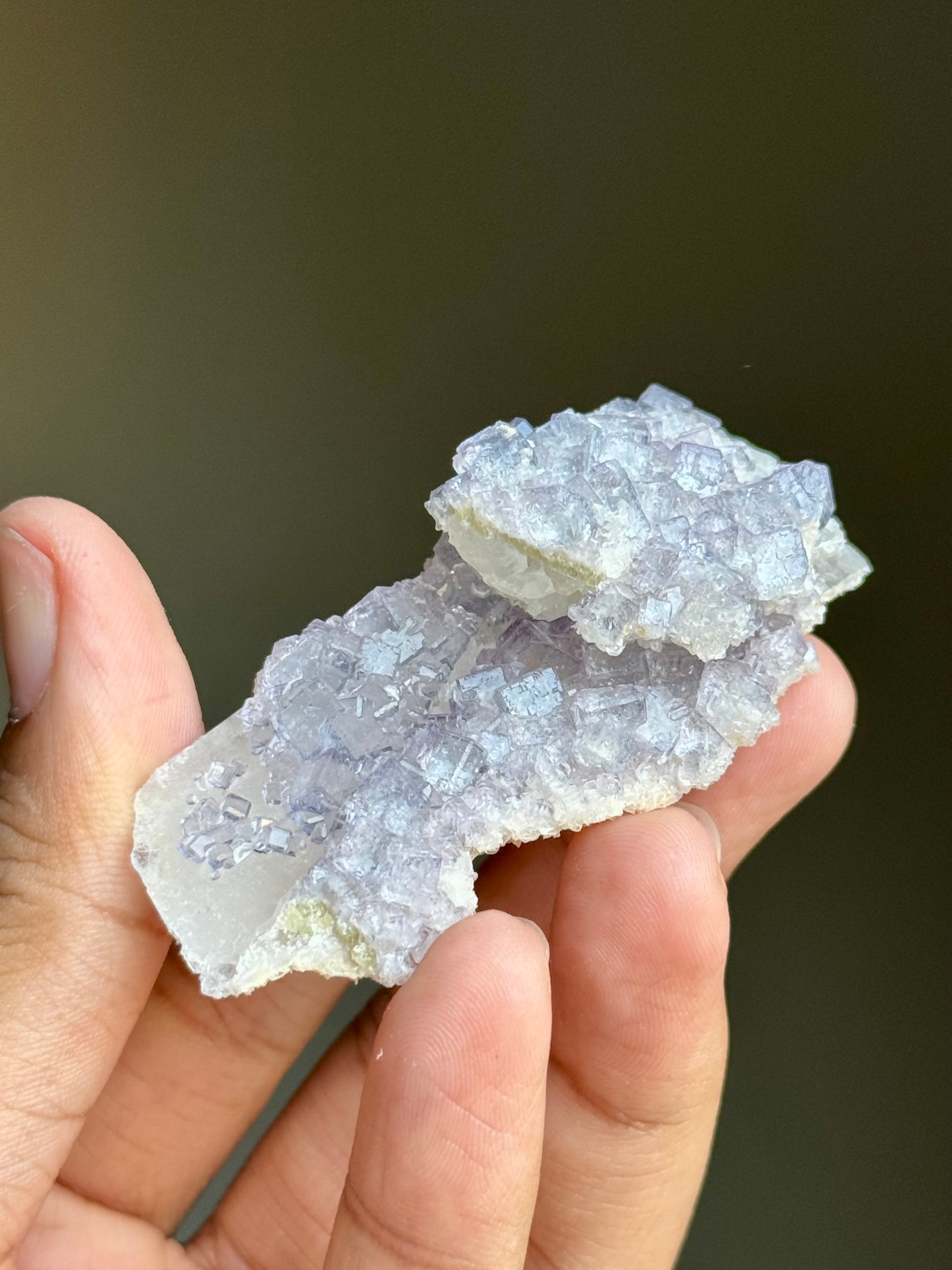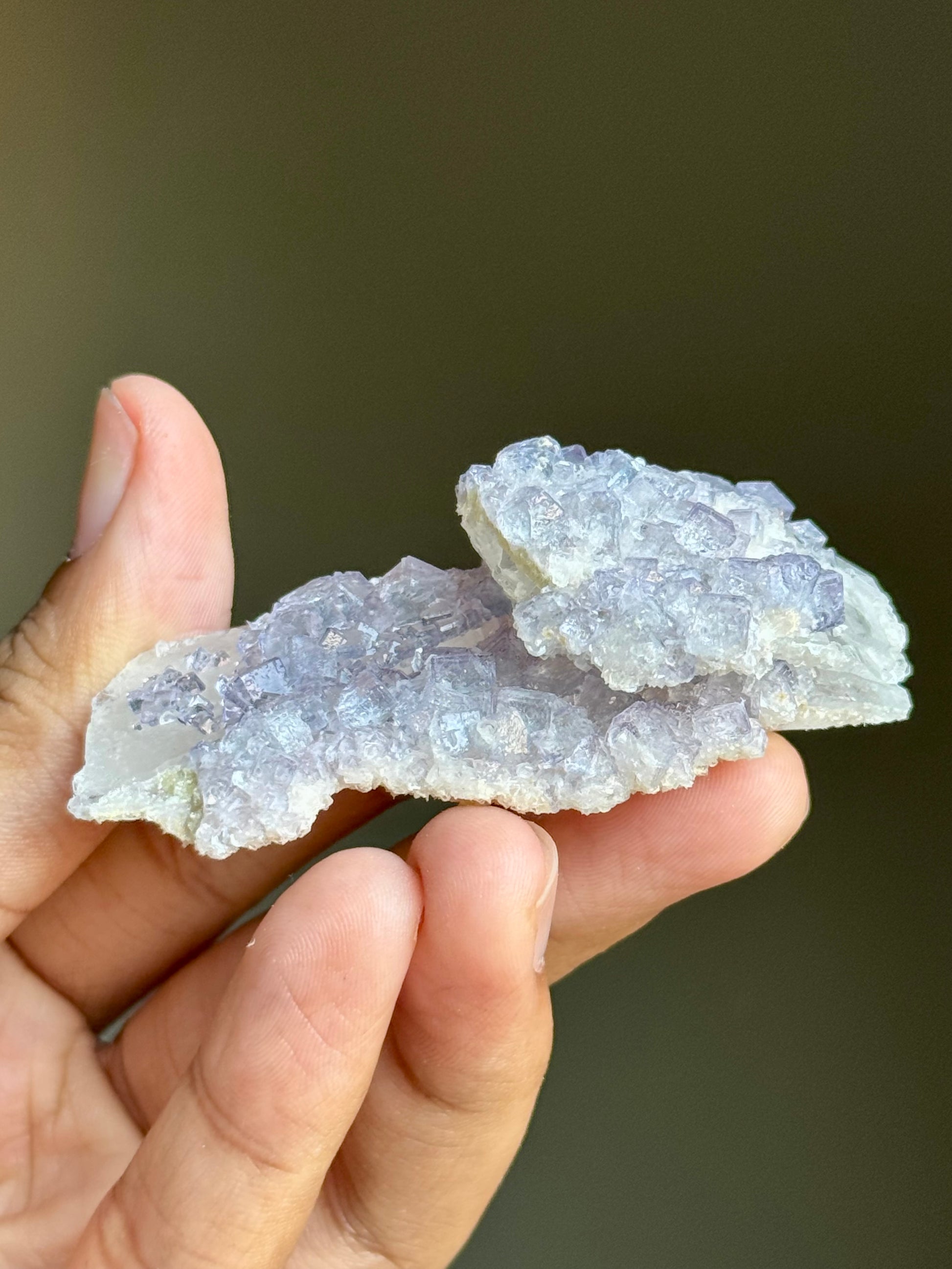 A cluster of periwinkle fluorite on a slab of quartz.