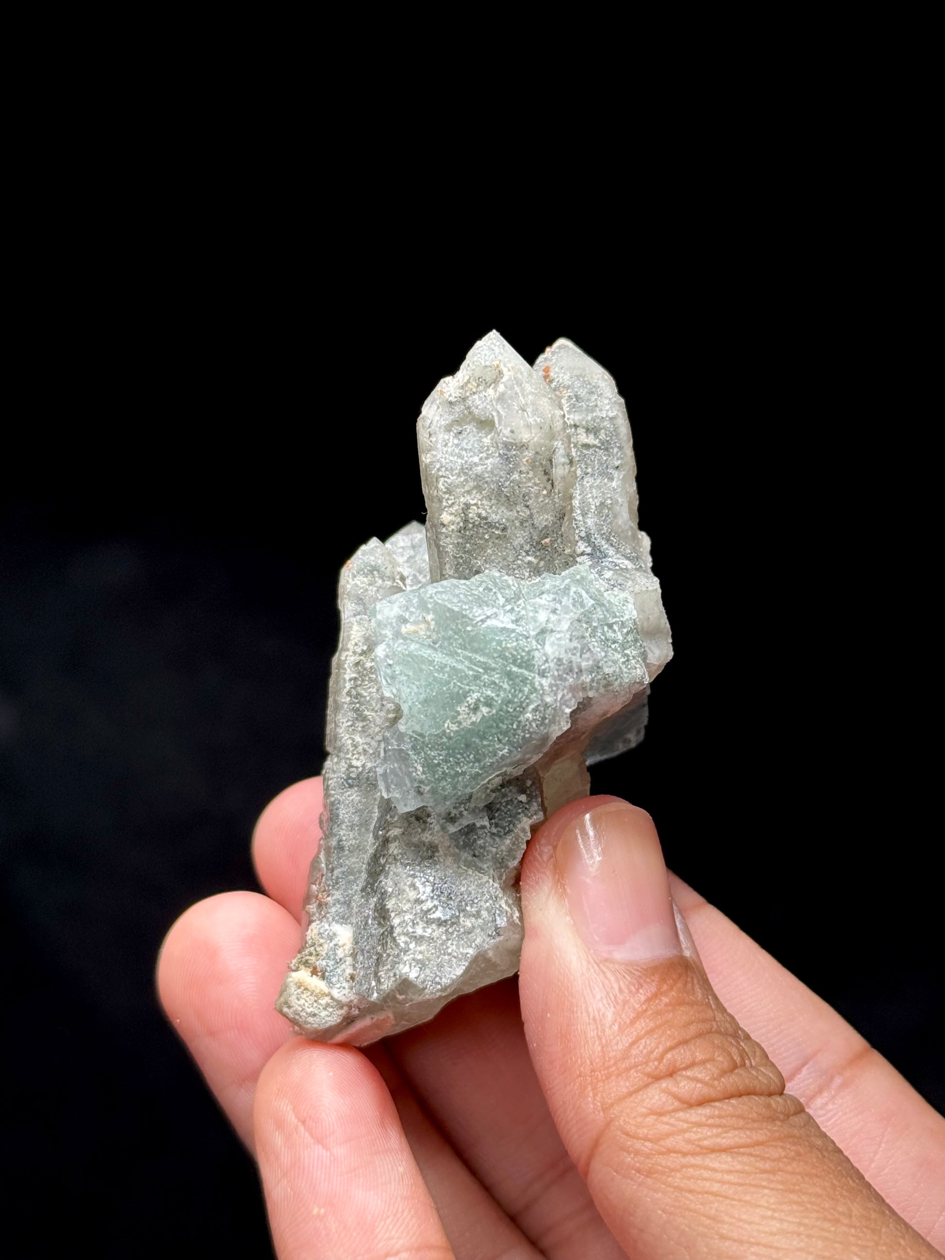 A structural smoky quartz piece with an octahedral fluorite perched in between its points.