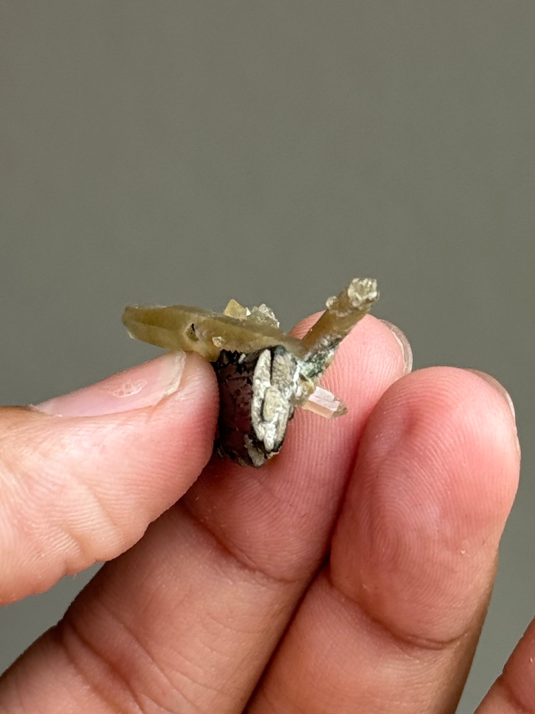 Here’s a cute combination piece that consists of a yellow quartz spray and a forest green hedenbergite fan!