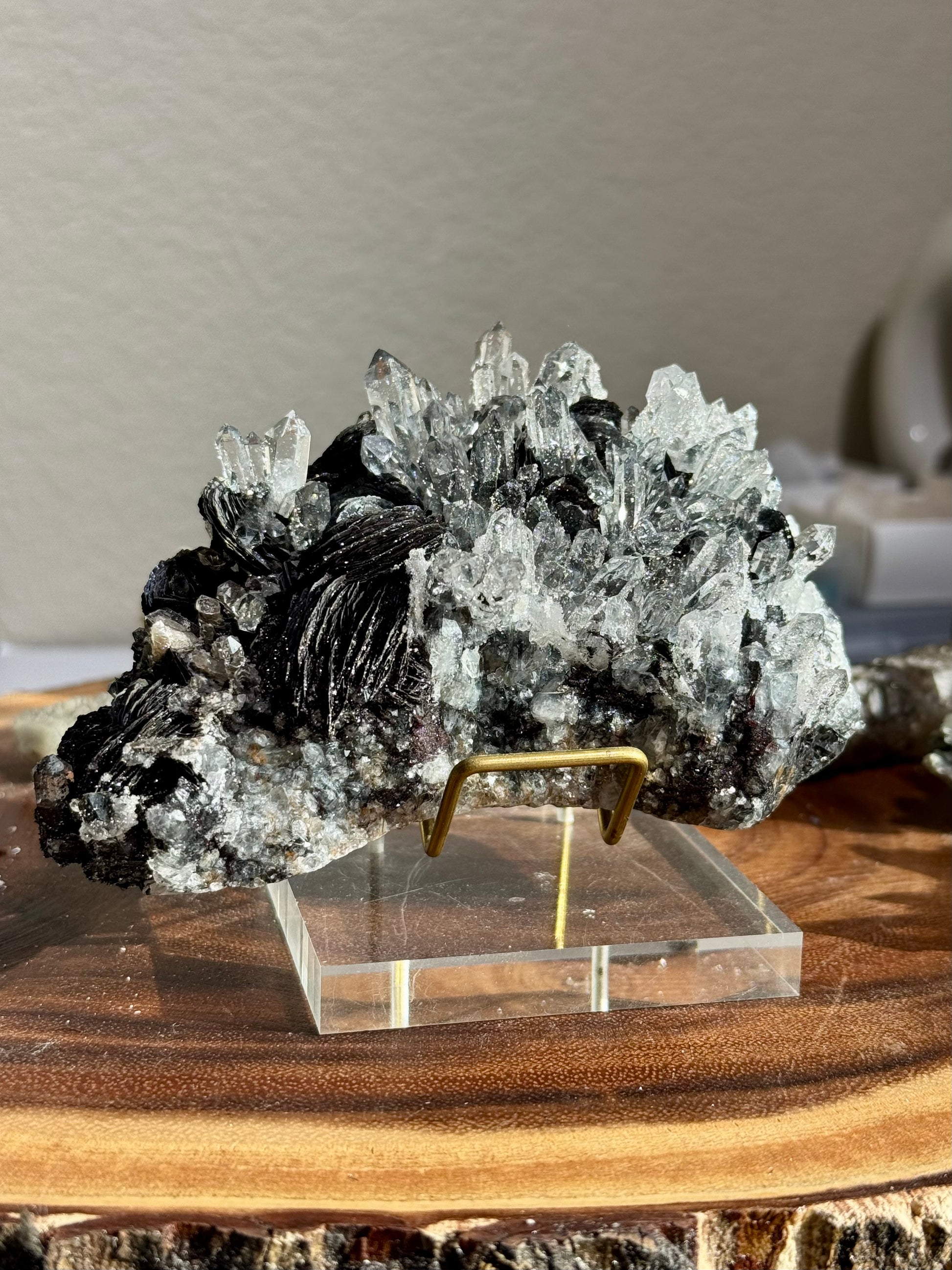 A rather high quality quartz cluster adorned with hematite rosettes. Part of the cluster has a shimmering quartz druze.