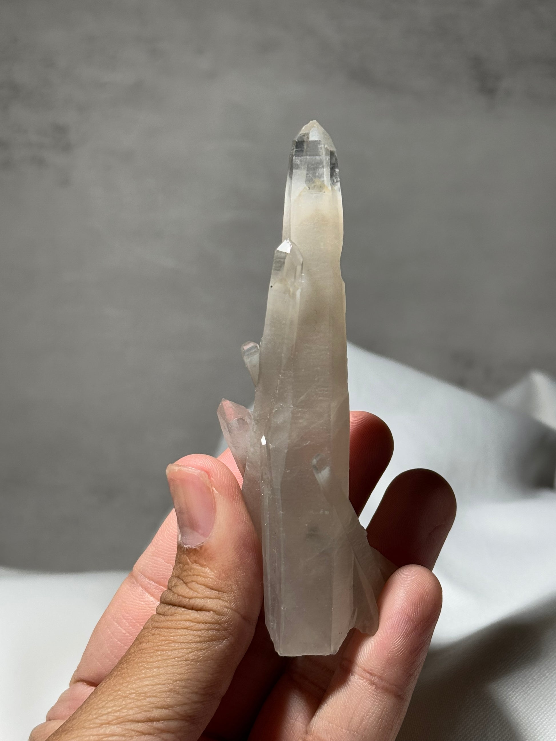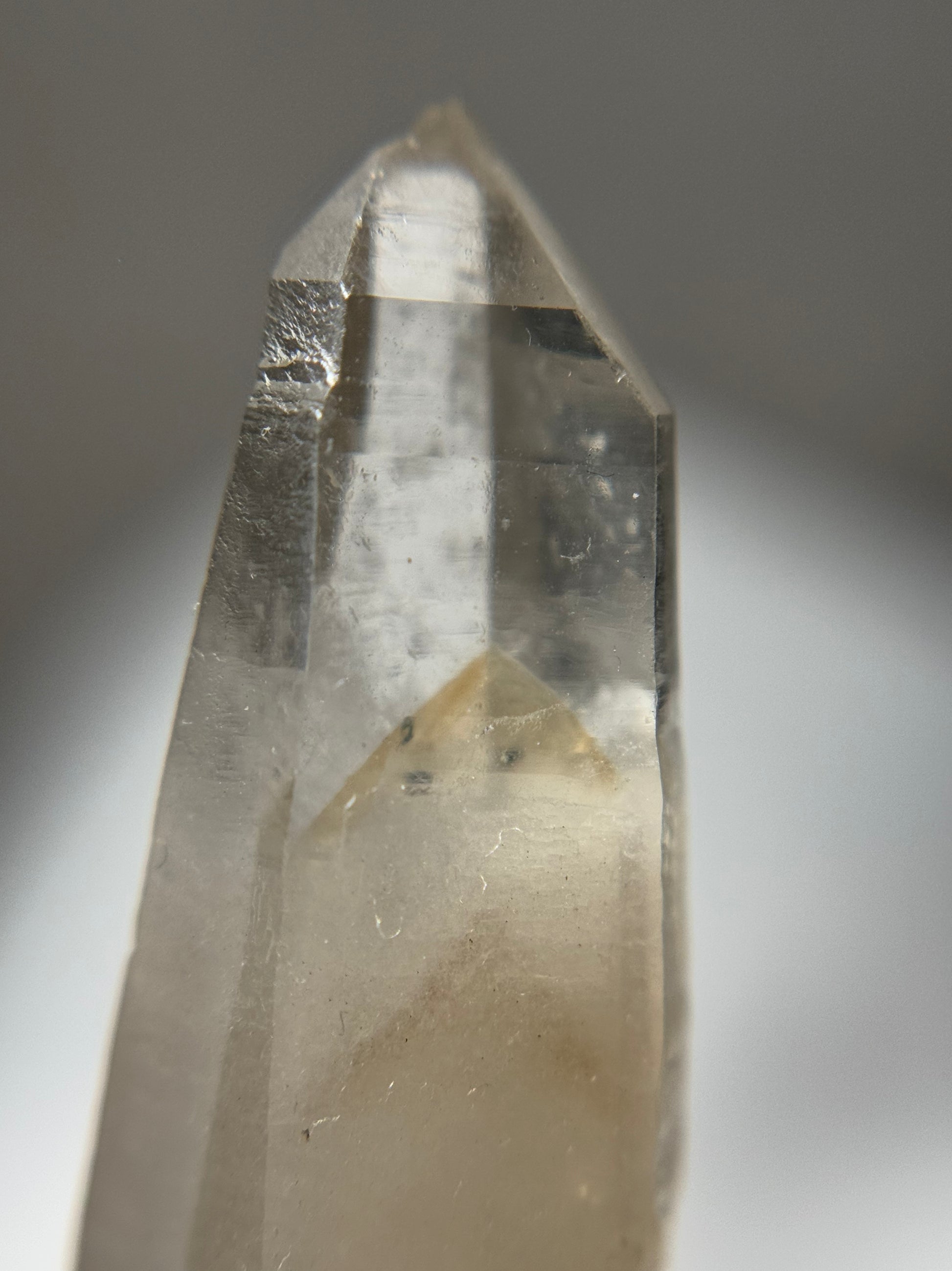 Heres a quartz from Inner Mongolia that has milk-latte toned inclusions in the body and crisp clarity at the termination. For this variety of quartz, they typically have a brown phantom near the termination.