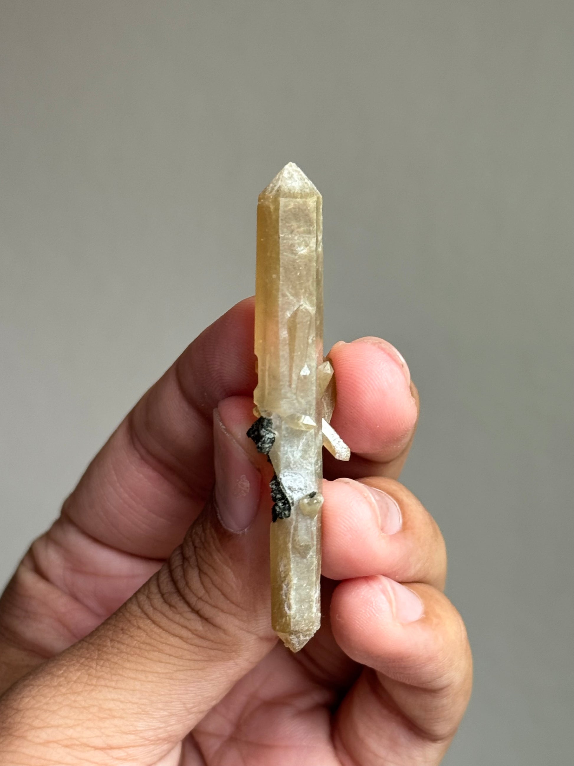 A very slender quartz DT with some hedenbergite association towards the mid-point.