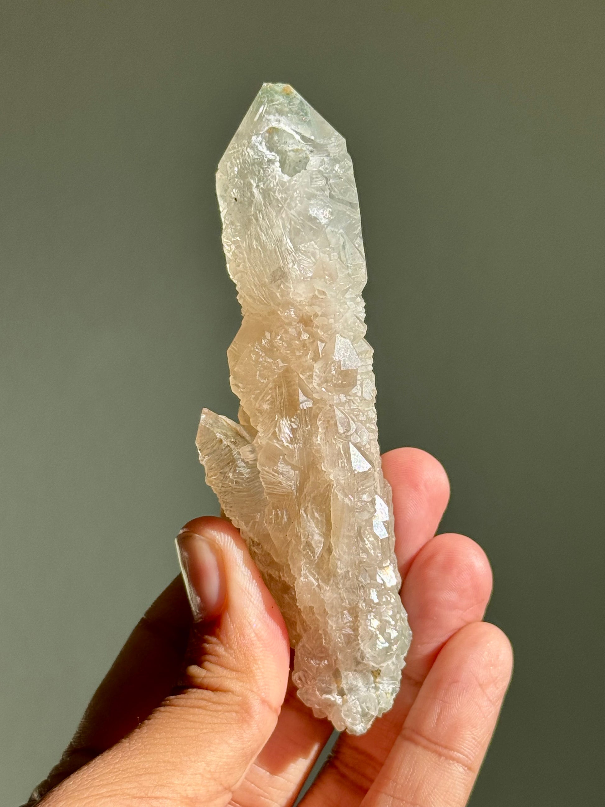 A larger quartz point with some chlorite inclusions and hematite inclusions within the main termination. The growth interference along the lower half of the piece adds additional flair, making this piece quite unique.
