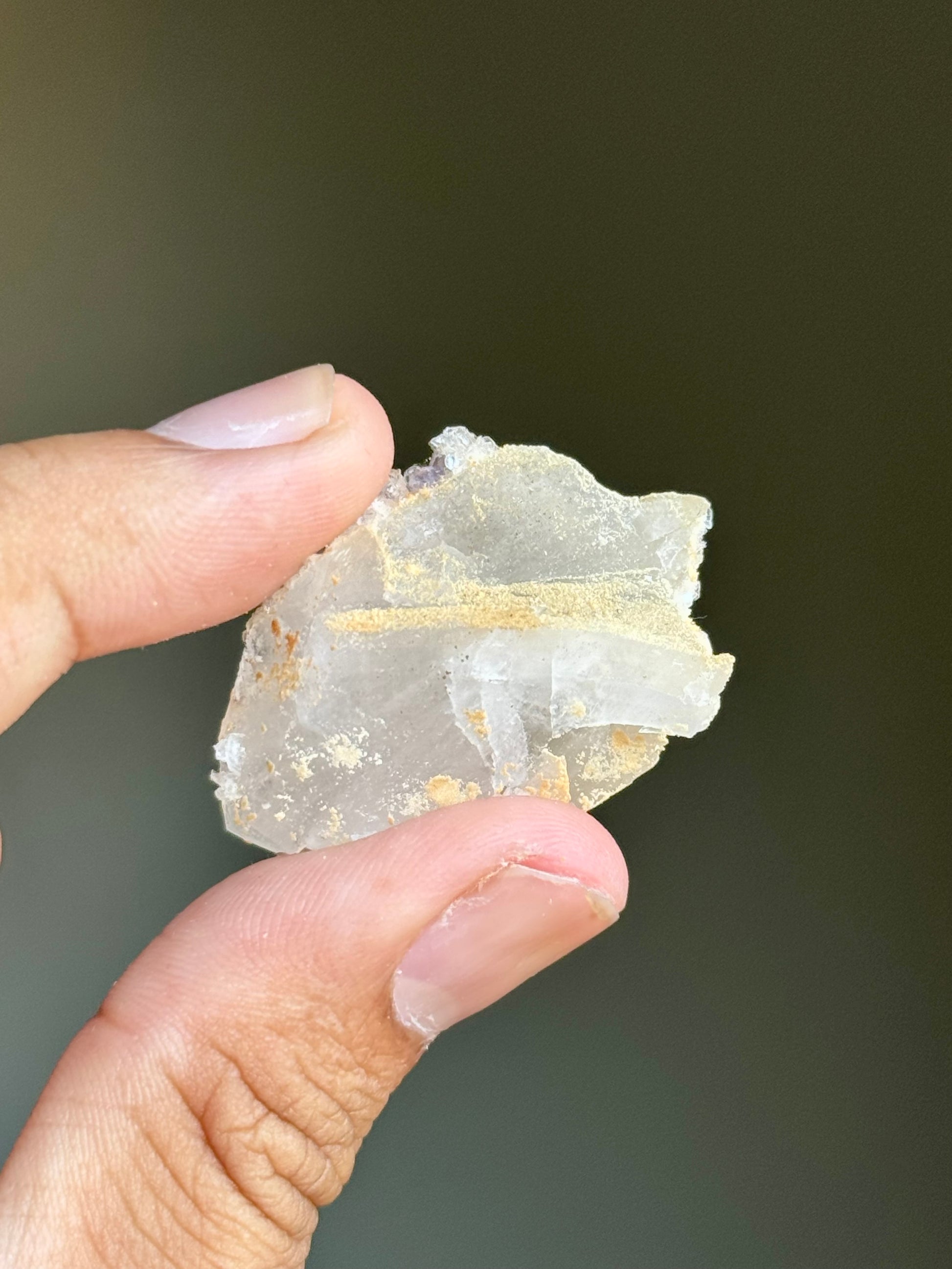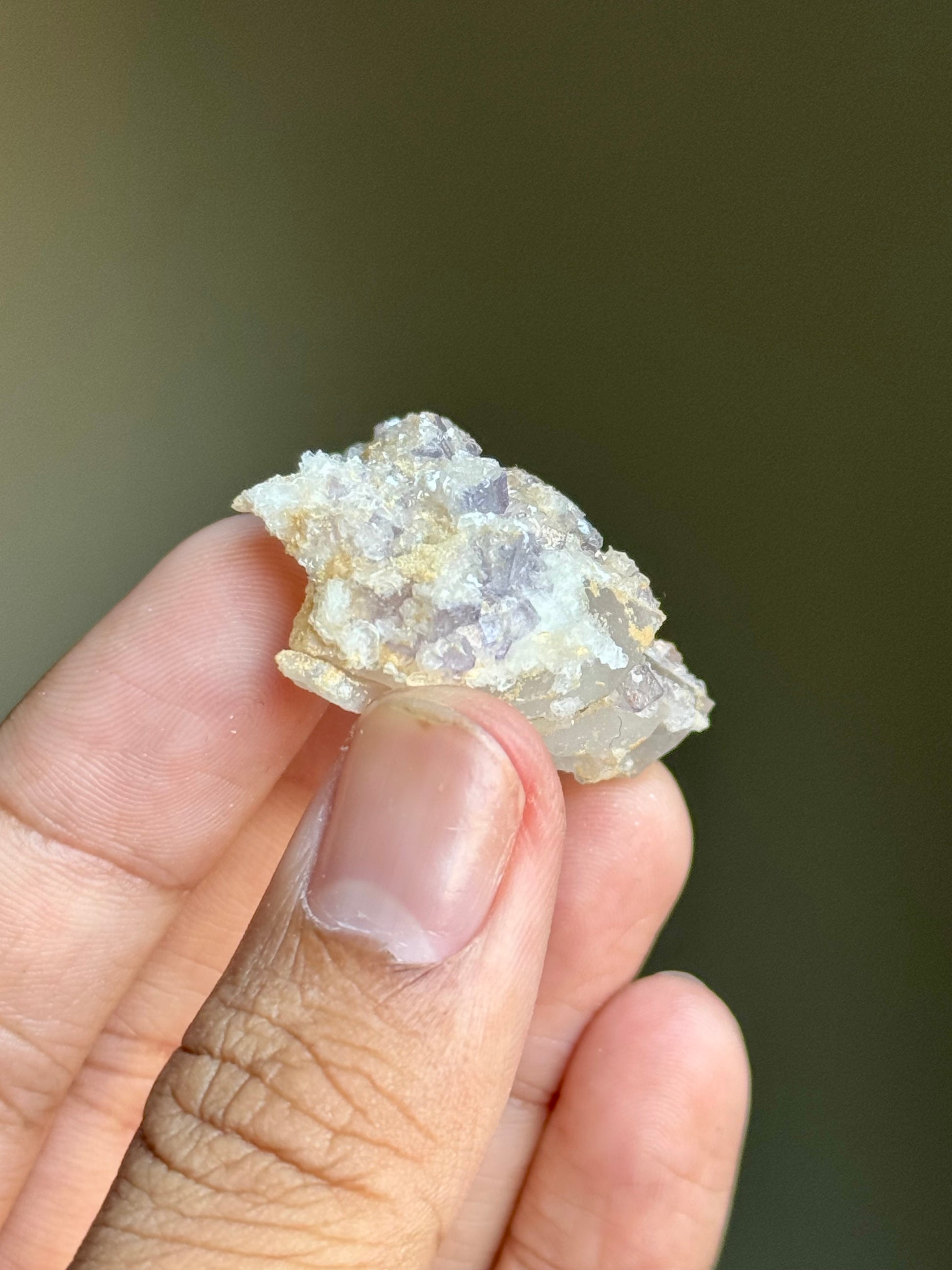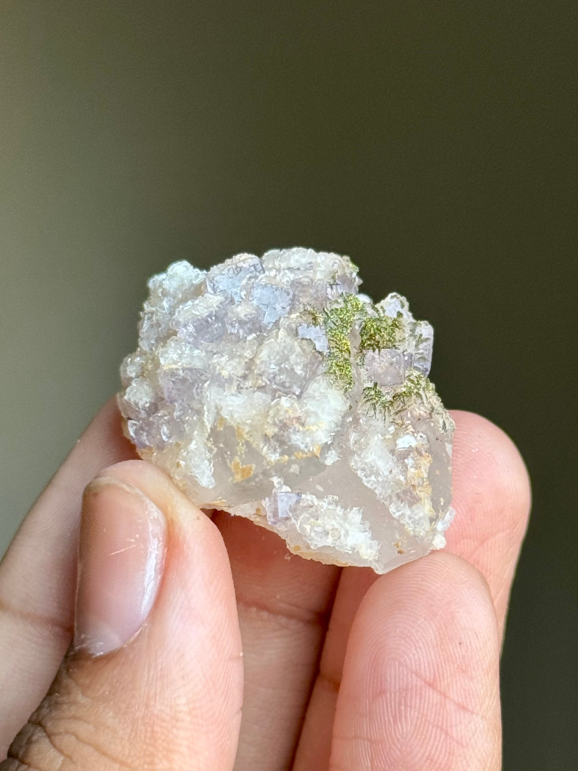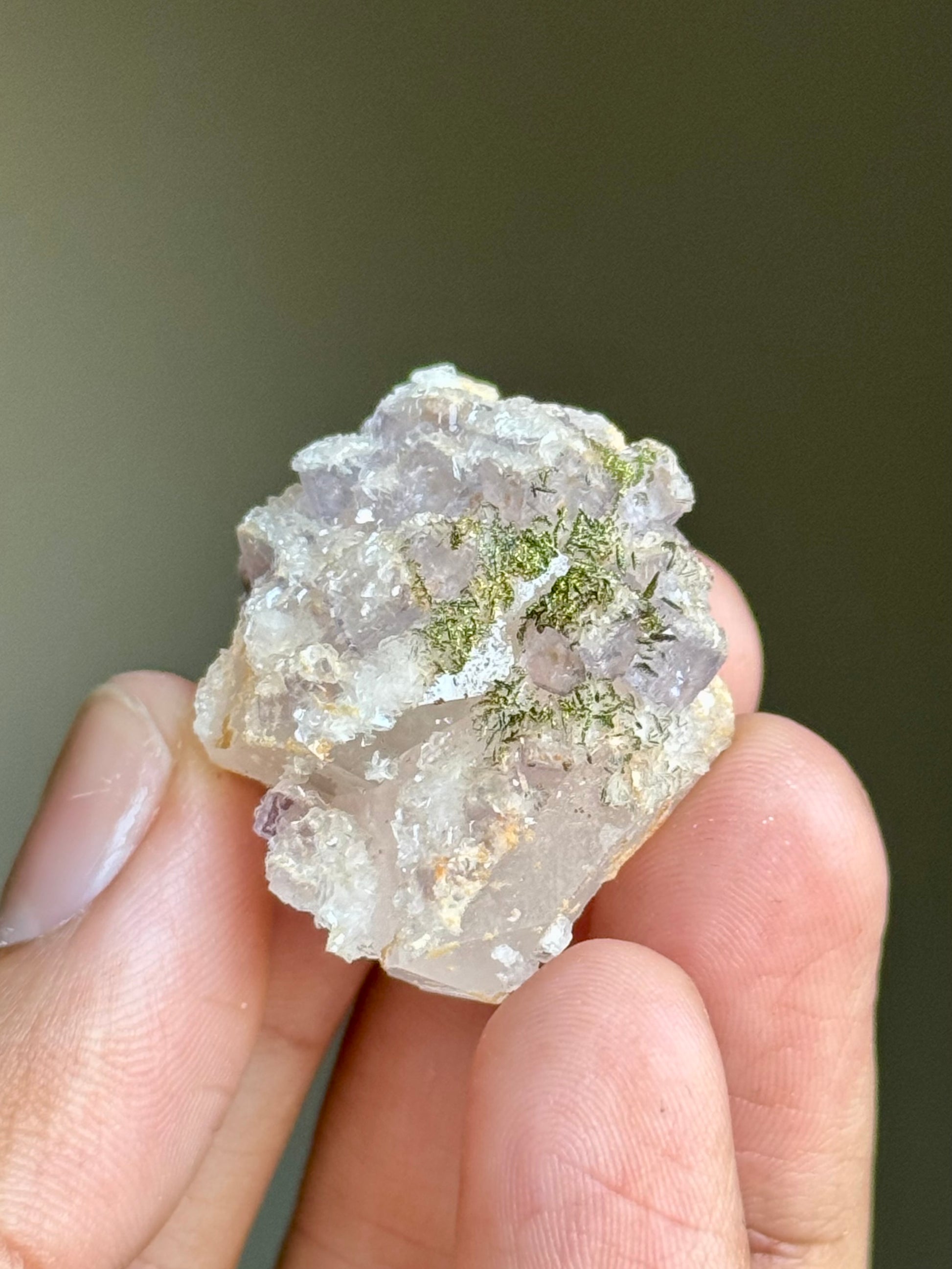 A small quartz piece with fluorite, dolomite and calcite. The calcite on this piece is coated with iridescent chalchopyrite.