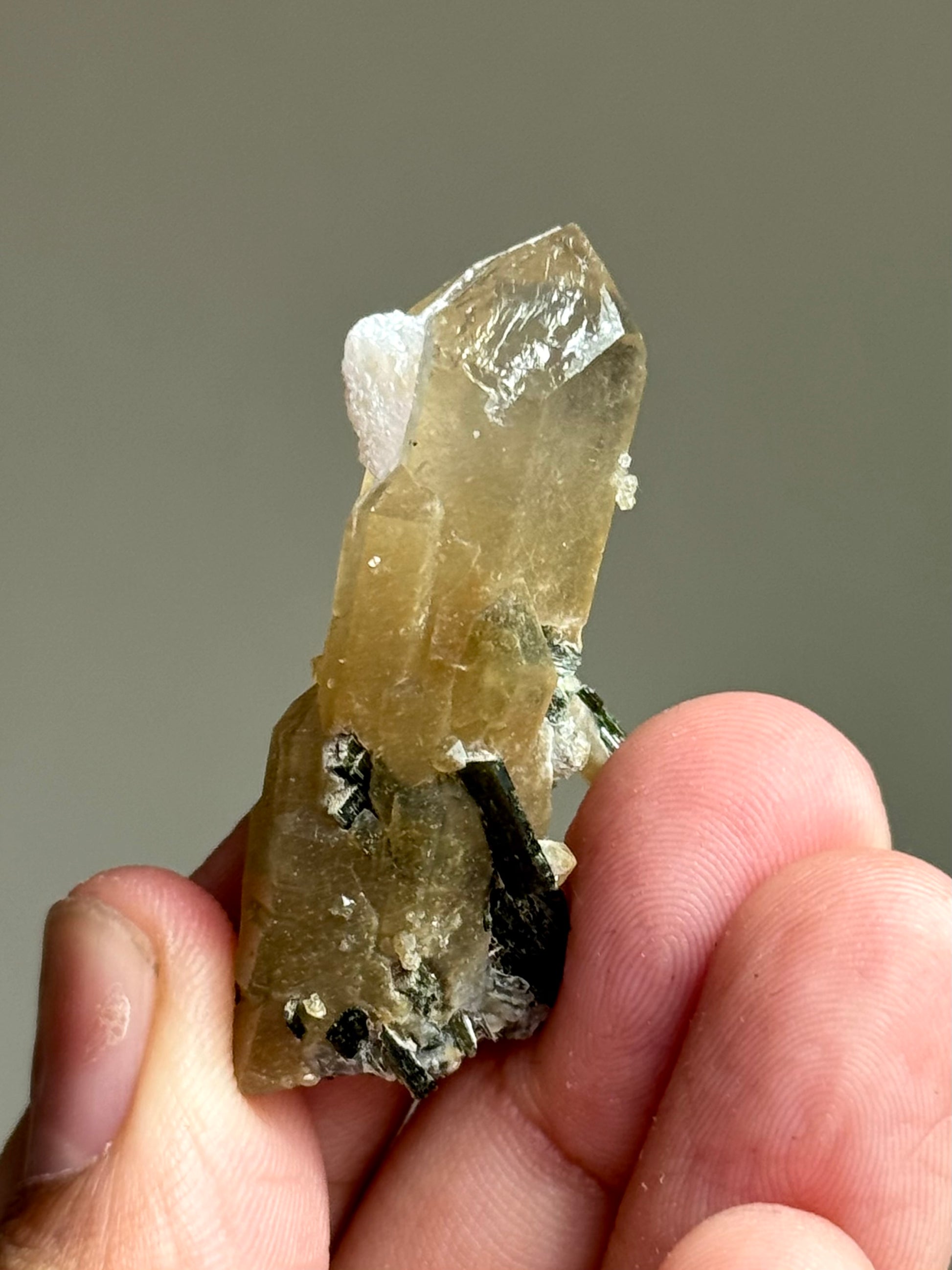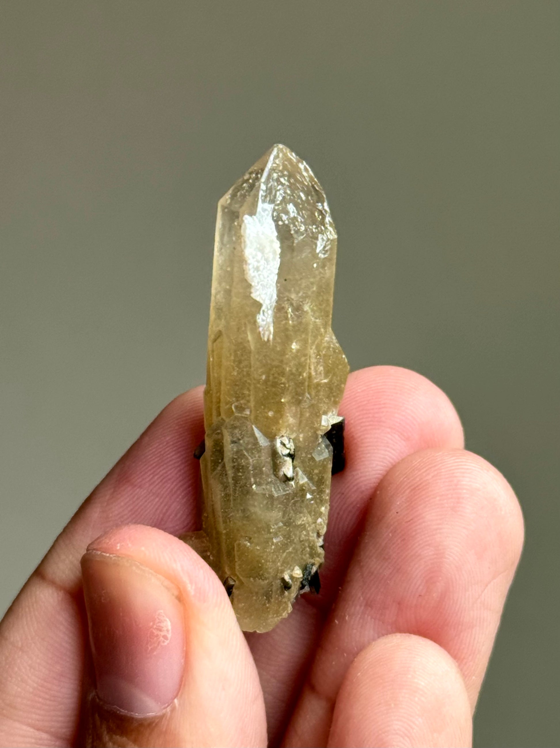 Here is a yellow quartz point with forest green hedenbergite penetrators.