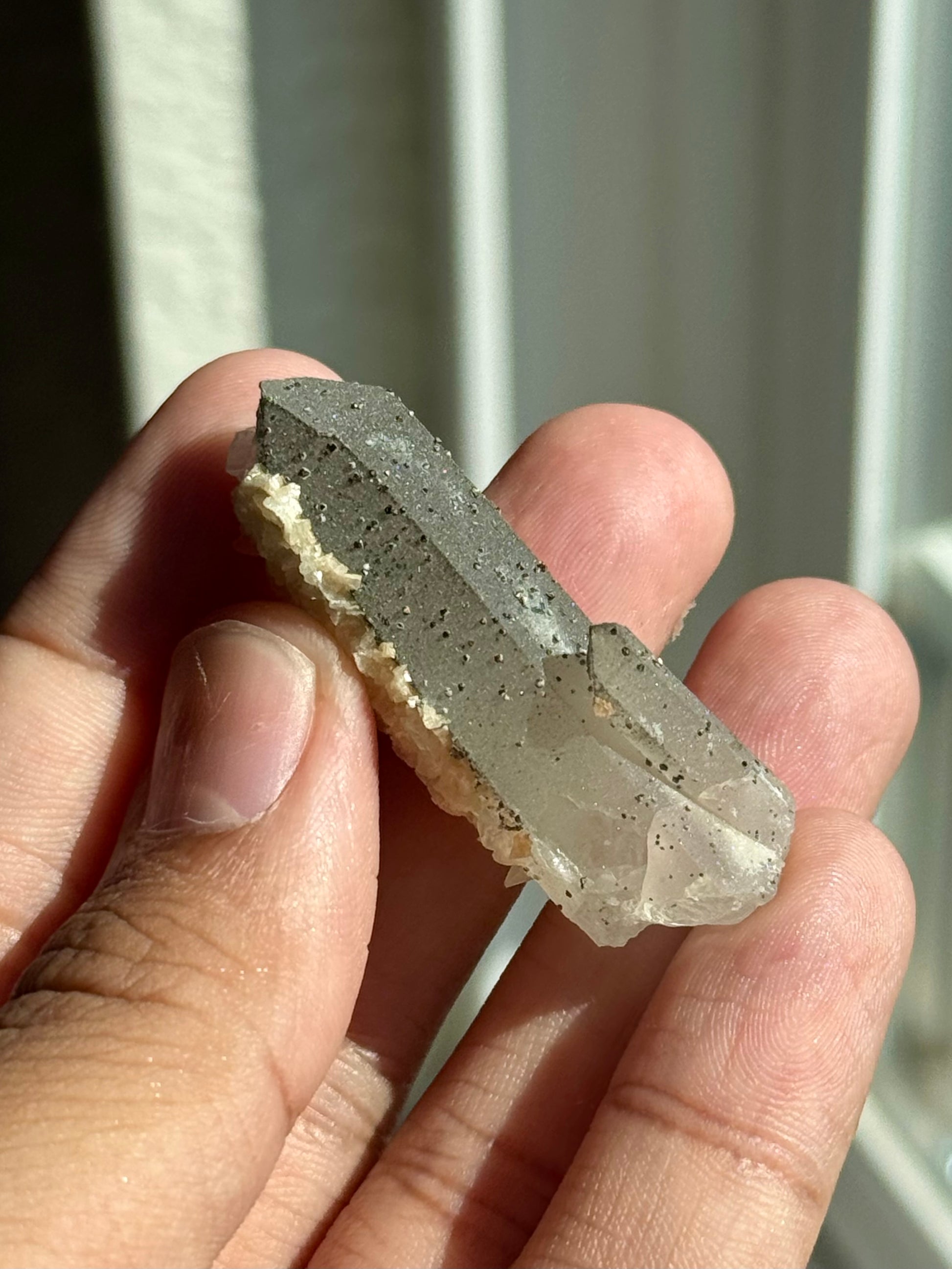 A quartz specimen coated with pyrite, dolomite and calcite.