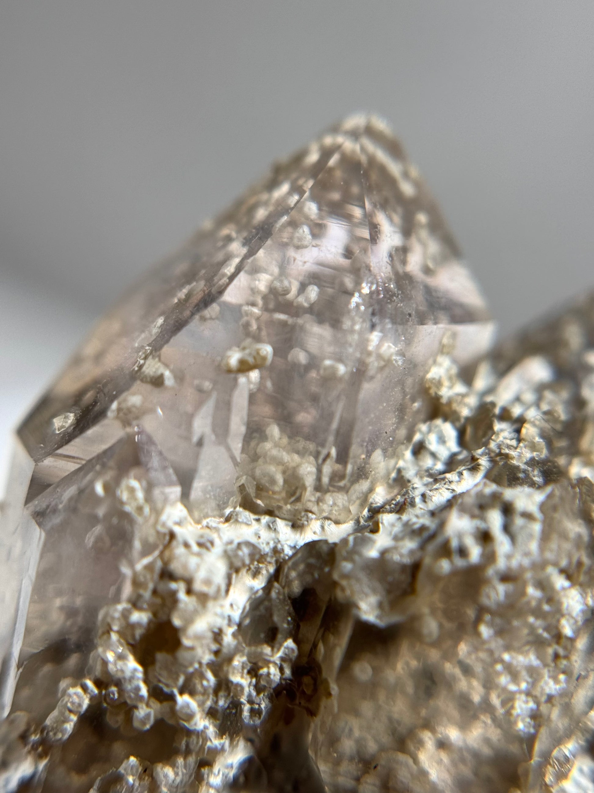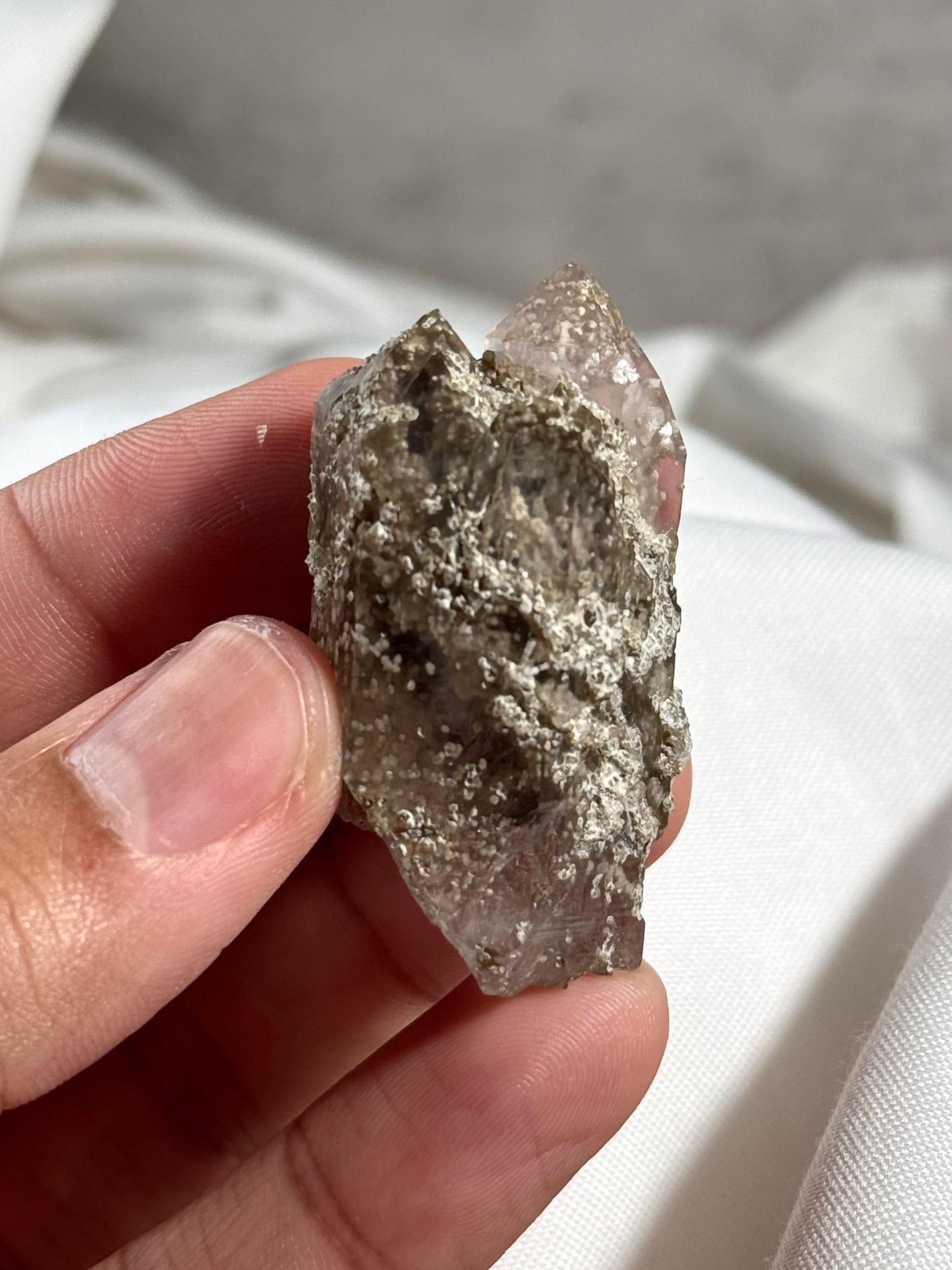 A small multi-point quartz piece with sepiolite inclusions. This piece also has some amethyst expression in the tallest point! The quartz also has striations along the body, which adds some extra flair when shown in the light.