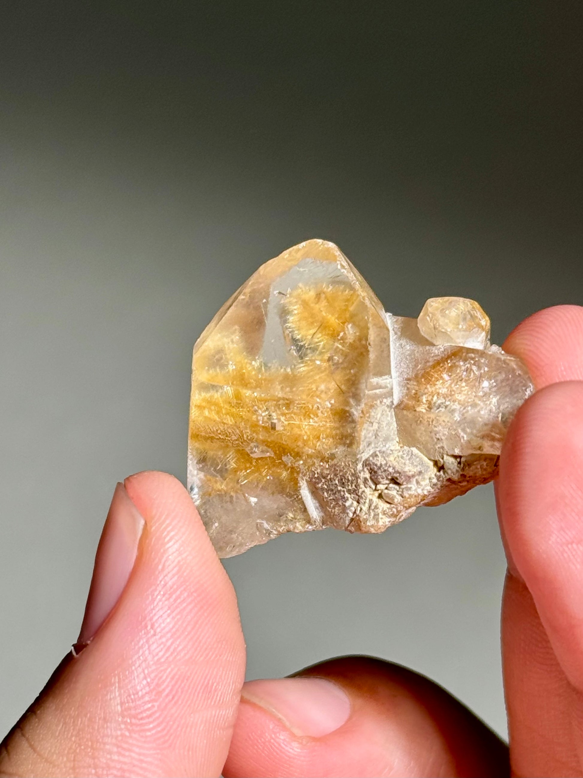 A small quartz piece with rutile inclusions and internal quartz crystals nestled into the rutile.