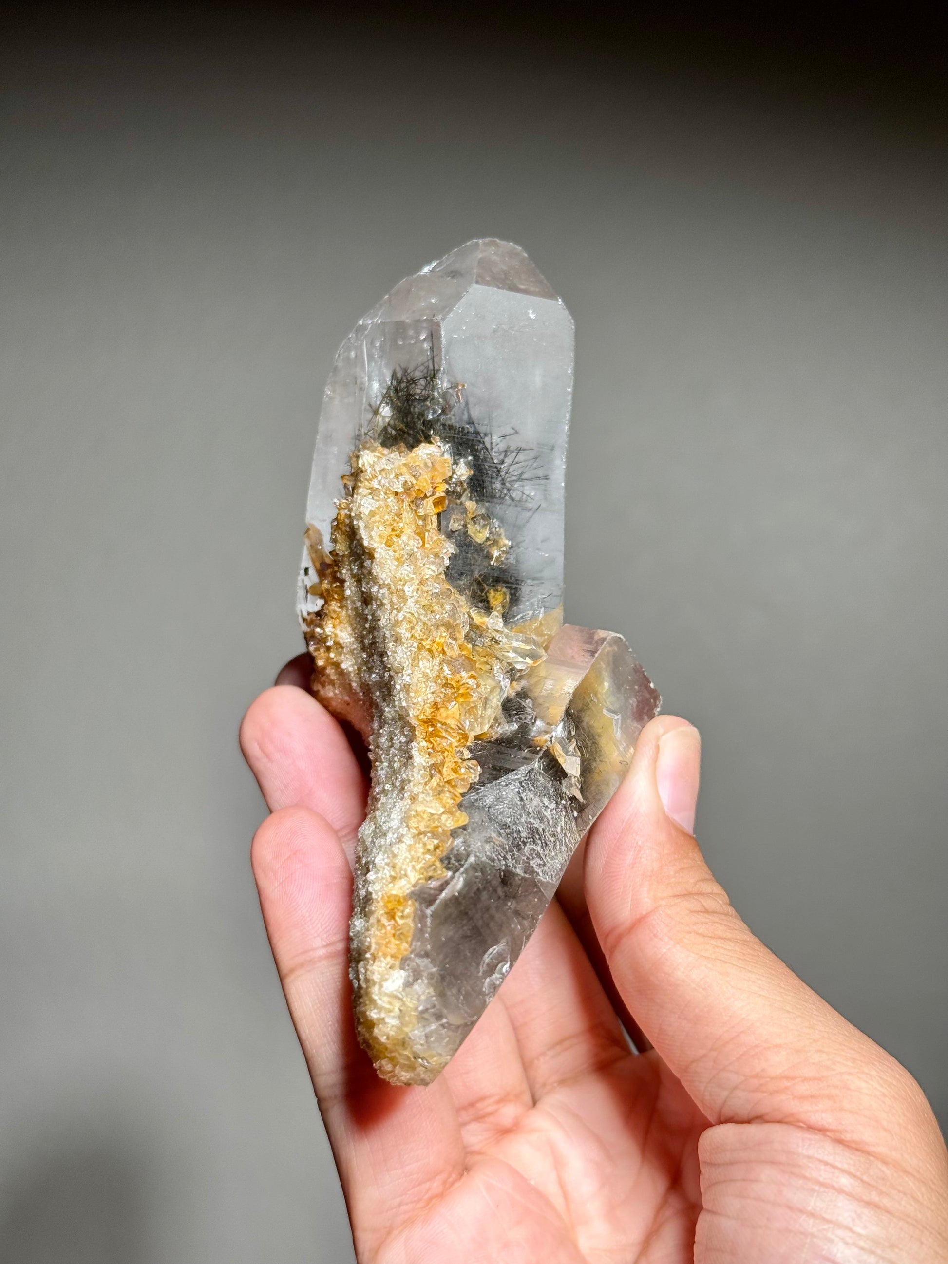 A large quartz piece with dark silver rutile inclusions. There are micro quartz crystals within the spray of rutile! This piece is coated with micro quartz crystals along the bottom side.