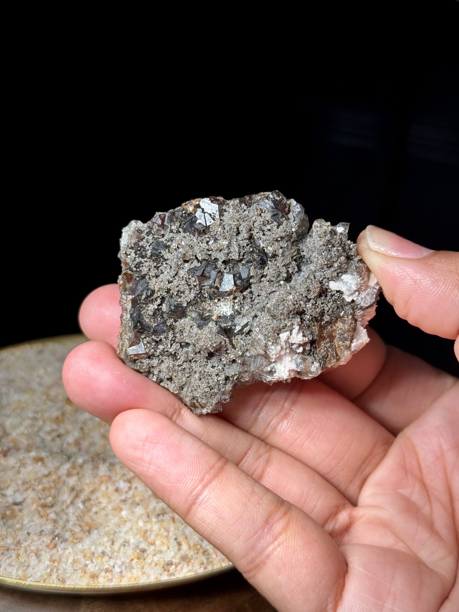 A glossy smoky amethyst plate with colors from brown to smoky purple throughout the piece and andradite garnets on the backside.