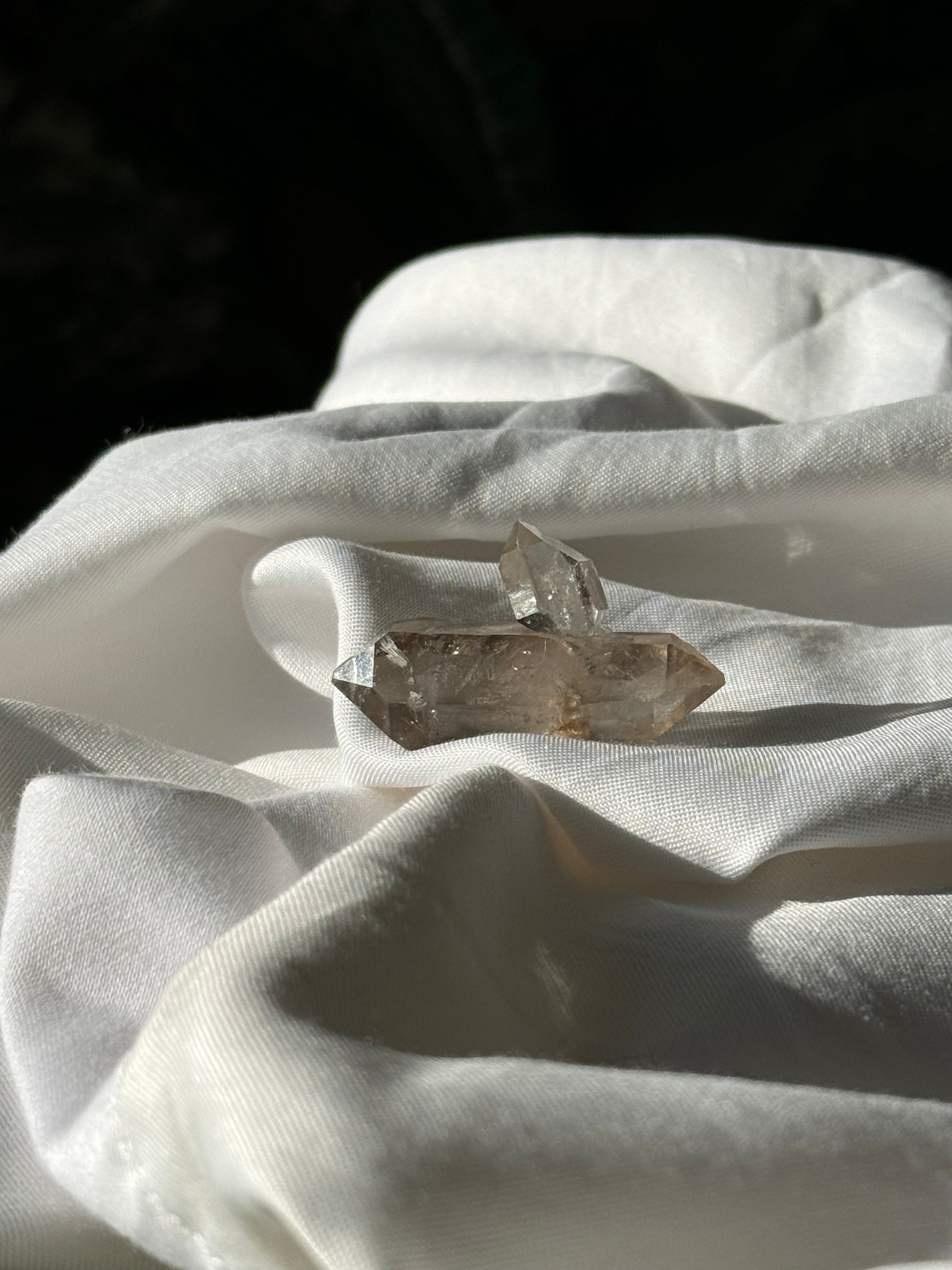Here is a slightly smoky quartz DT with another quartz protruding out of the main body. Both terminations have contact damage.