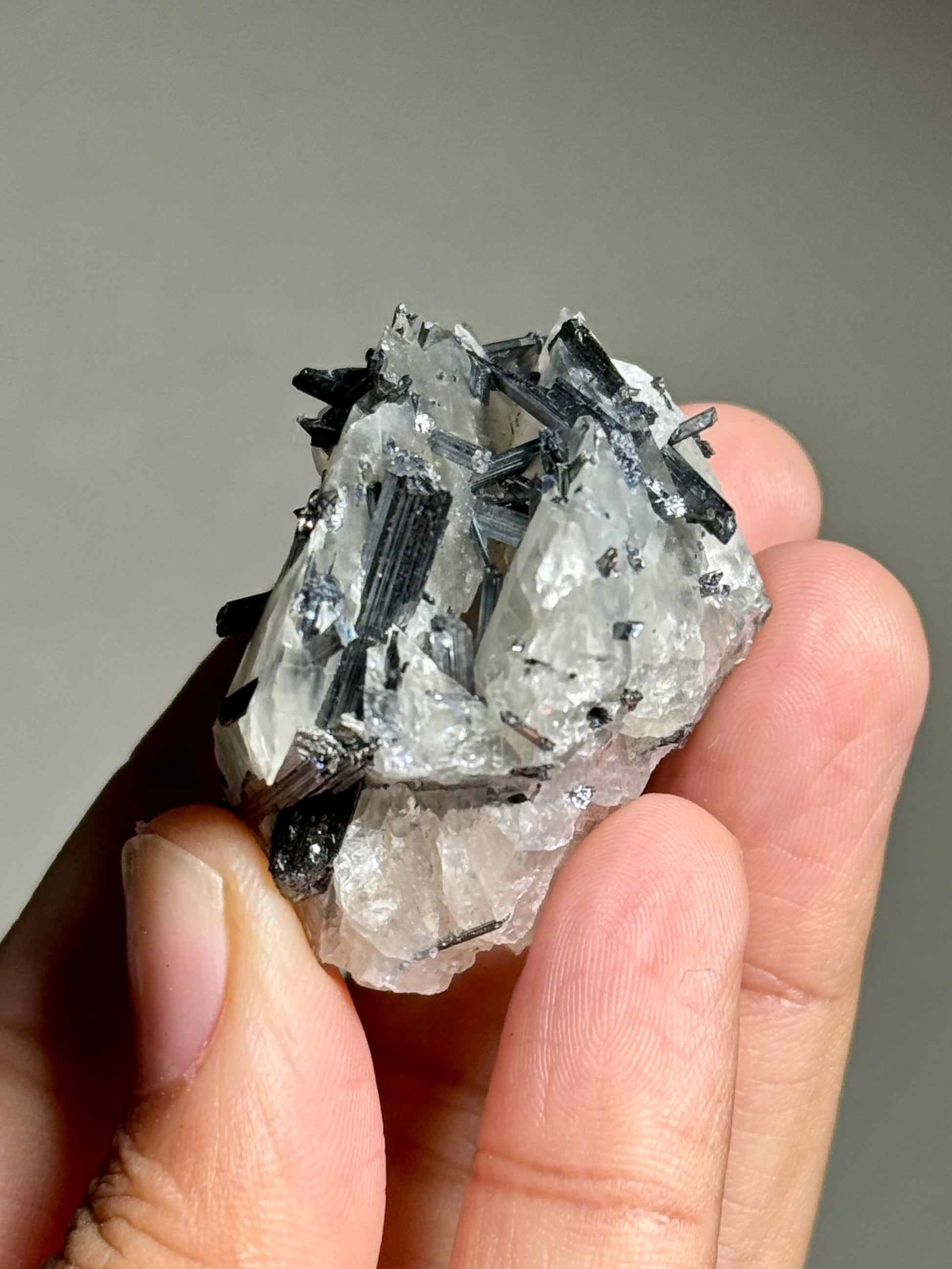 A calcite specimen with stibnite penetrating the piece throughout.