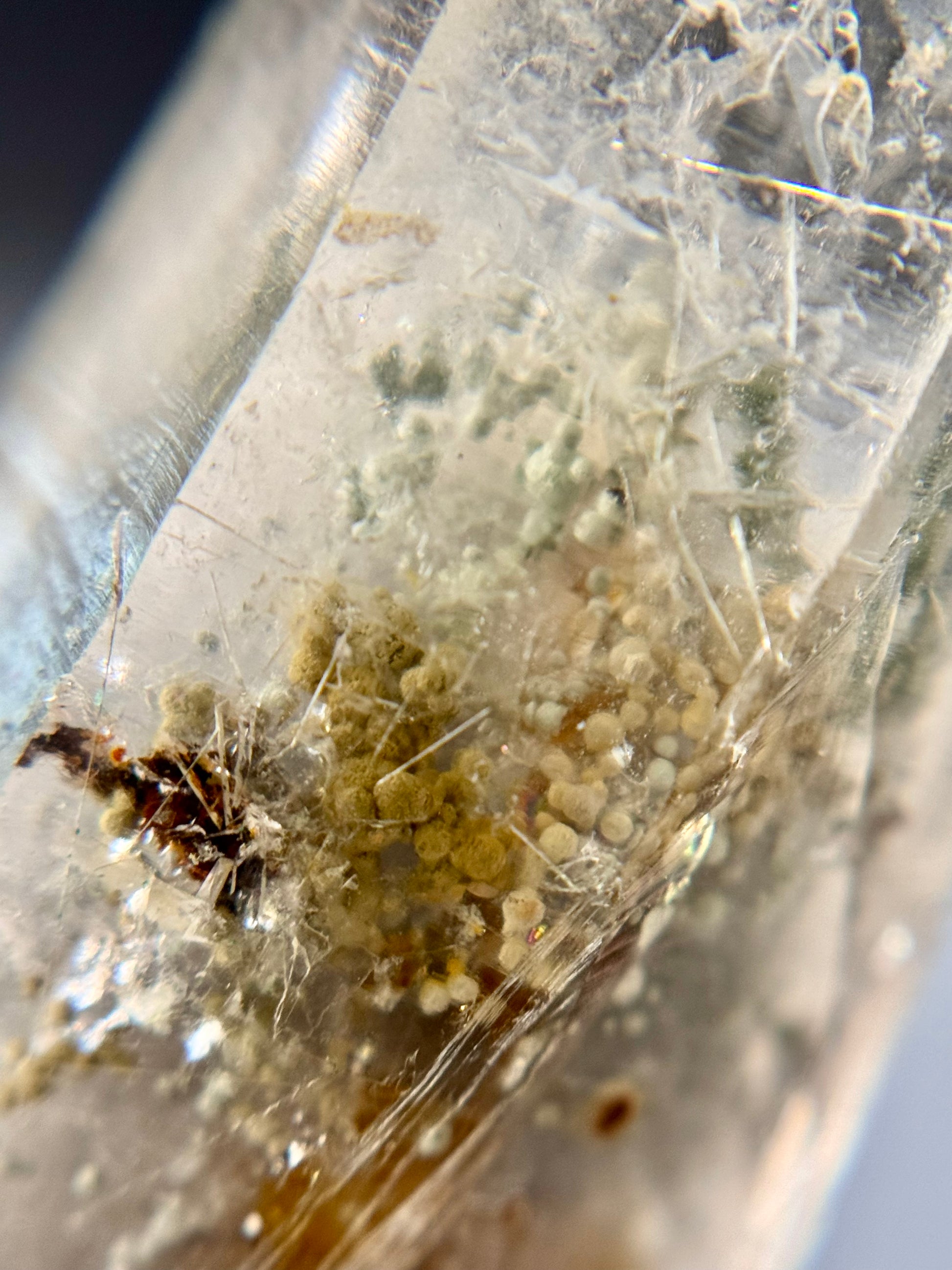 A large quartz point with cookite & tremolite inclusions. This specific quartz variation from Japan is also known as Marimo Quartz, due to the Cookite inclusions looking similar to marimo moss balls.